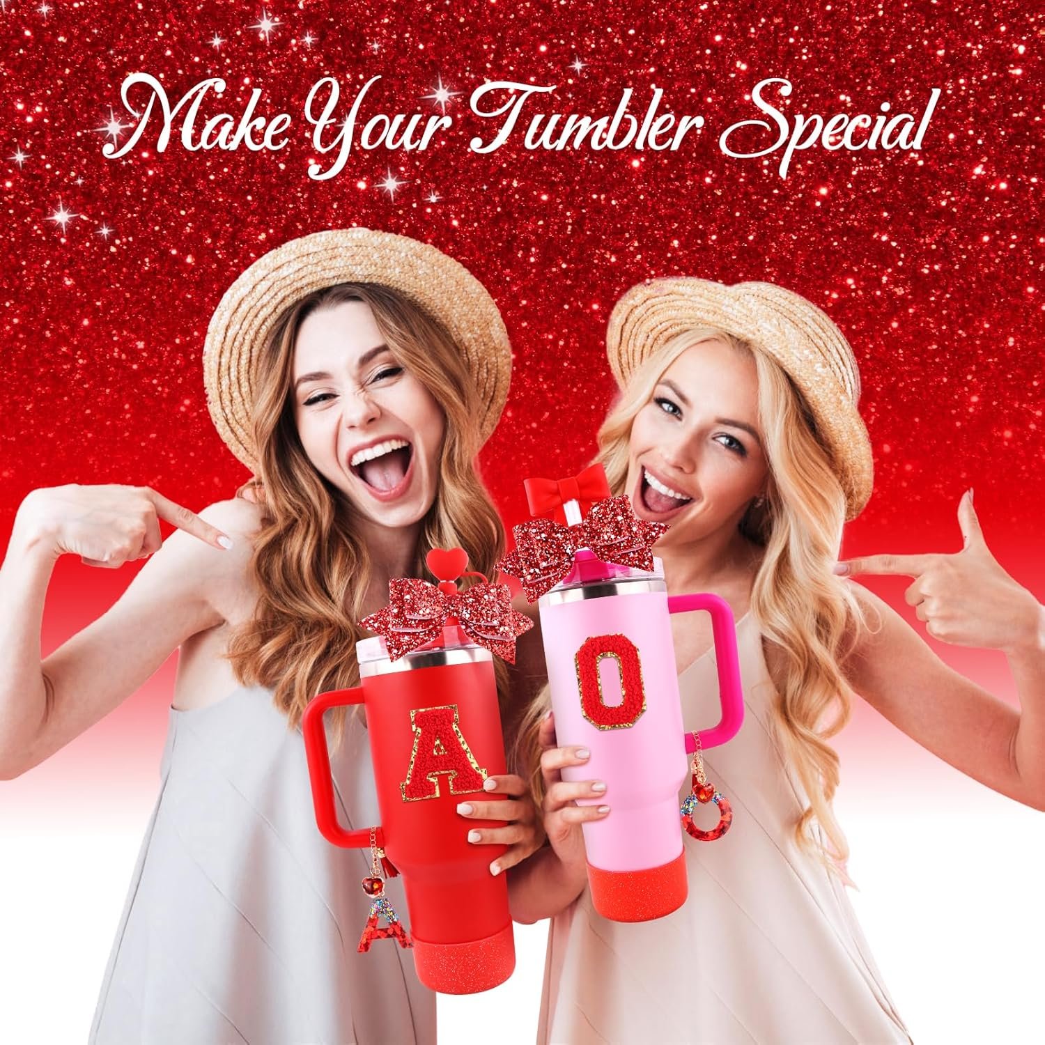 Perfect Tumbler Accessories Set: Our product includes 1pc red letter charm, 1pc glitter silicone boot, 1pc red heart straw cover, 1pc bow-shaped straw topper, 1pc initial letter sticker and 1pc shining bow decoration for straw. This shining red water bottle accessories set will make you shine bright like a diamond!