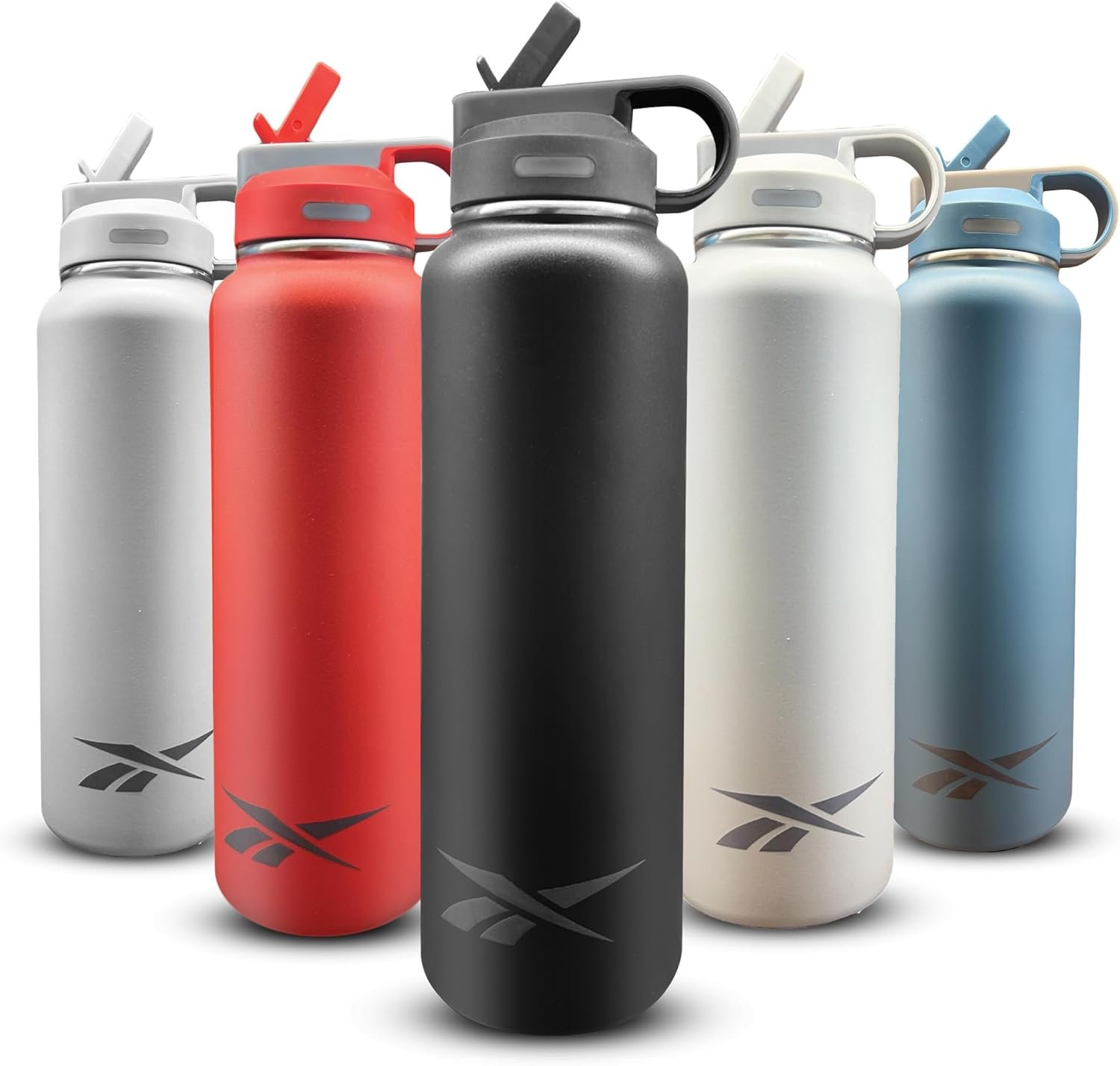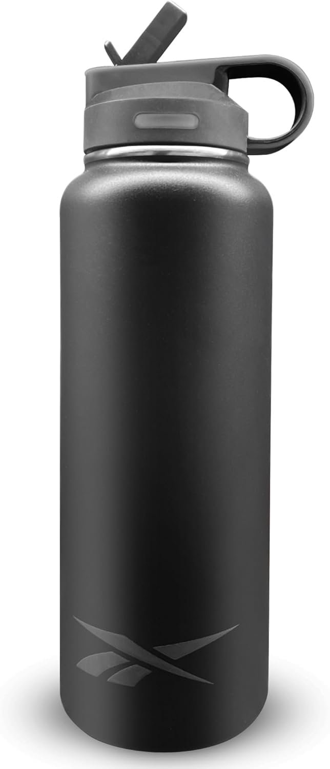 Reebok Stainless Steel Water Bottle With Straw & Athletic Design – Insulated Water Bottles 32 oz – Double Wall Vacuum Insulated Sports Water Bottle With Straw, BPA Free (Black)