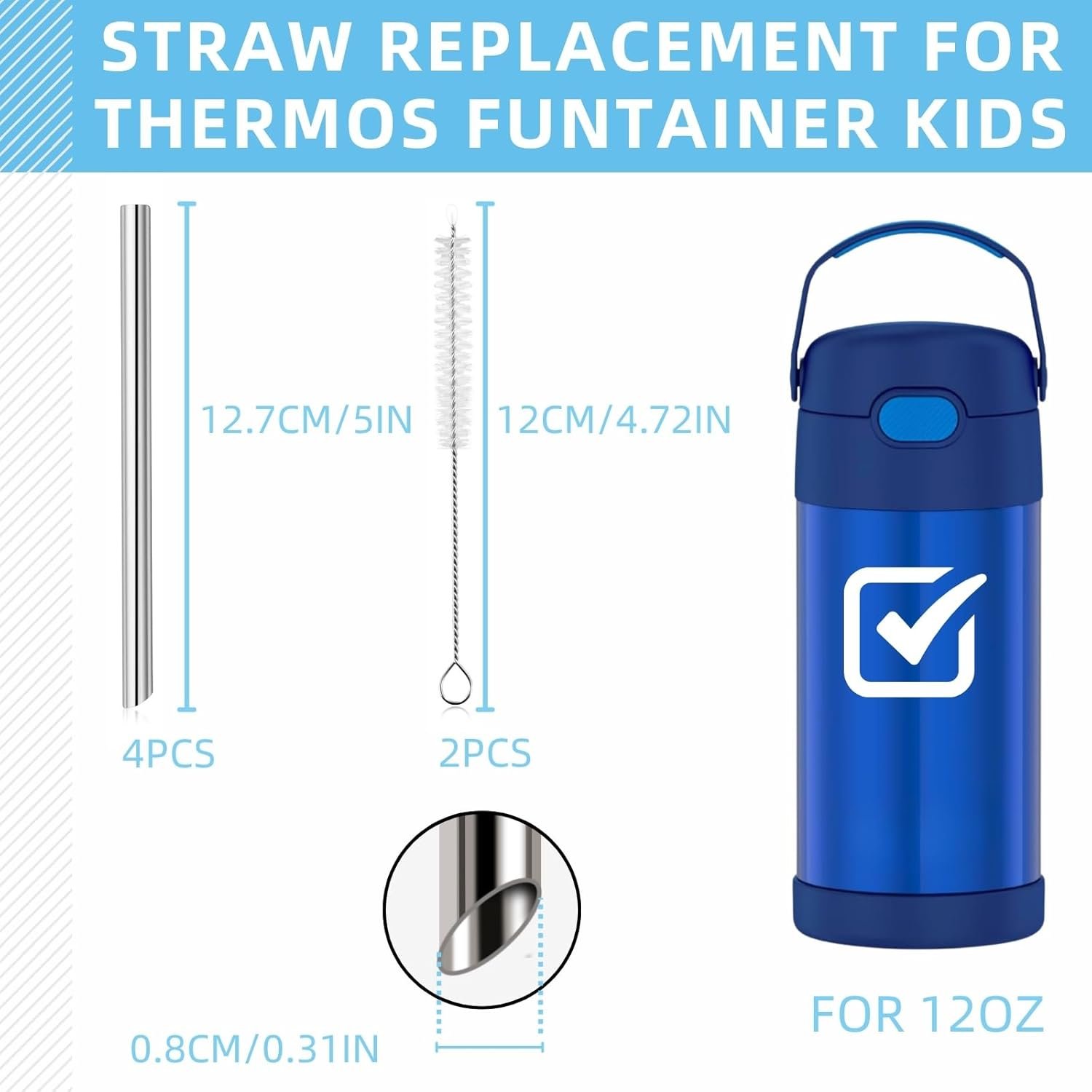 Compatibility: Our stainless steel metal straws are the same size as the original plastic straws, compatible with THERMOS FUNTAINER 12 OZ Stainless Steel Kids Straw Bottle. Please note that our product is not sponsored or endorsed by, or affiliated with the brands it fits, including THERMOS.