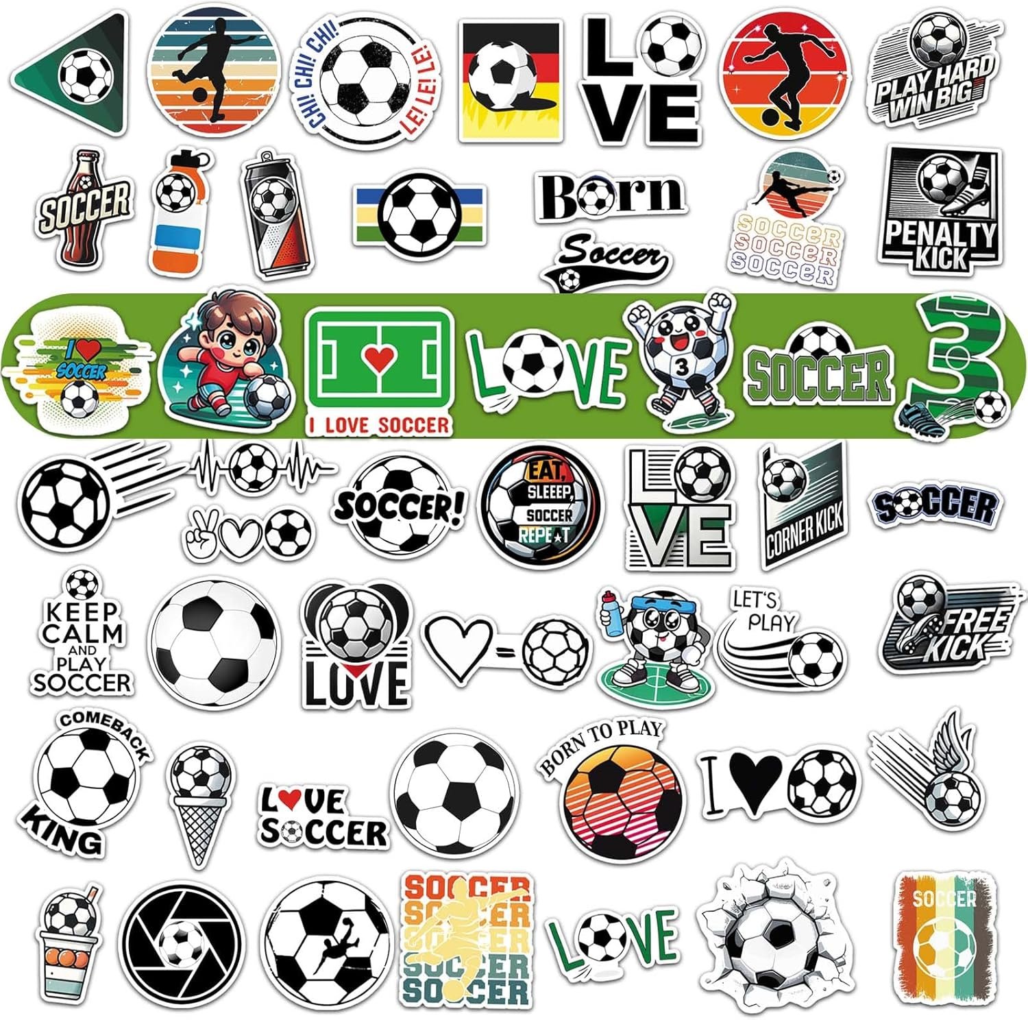 100 PCS Soccer Stickers:High definition printing stickers are made of high quality vinyl, non-toxic, waterproof, durable, remove without residues and repositionable. Each sized about 2.2inch. They can create their own personalized insulated water bottle, making it easy to find their sports water bottle and enjoy drinking. Stickers can also be placed anywhere they like, such as cups, helmets, soccer bats, etc.