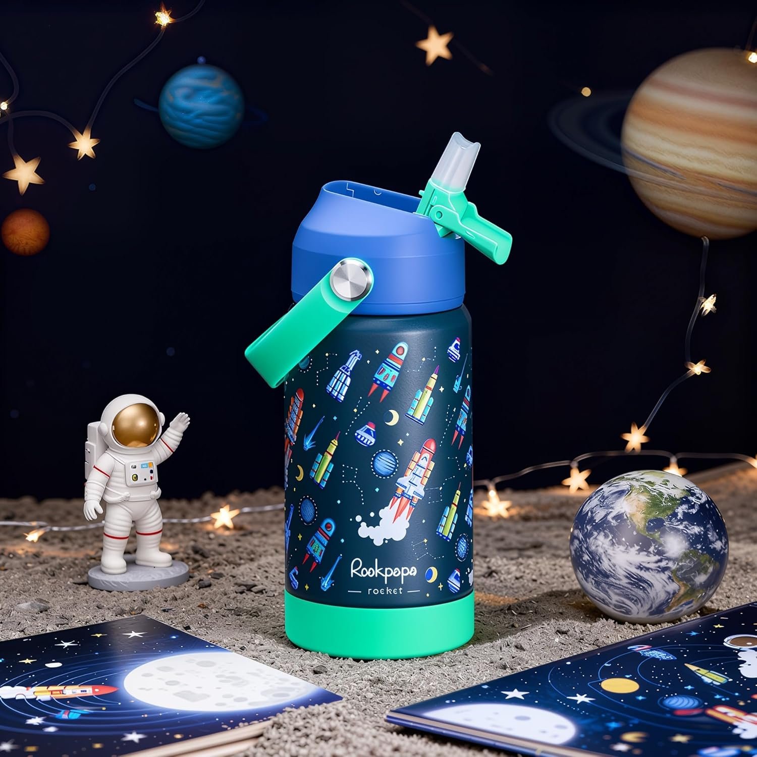 rockpapa Kids Insulated Water Bottle with Straw, BPA-Free, 18/8 Stainless Steel, Leak Proof, 14OZ Metal Cup Water Bottle for School Boys Girls (Blue Rocket)