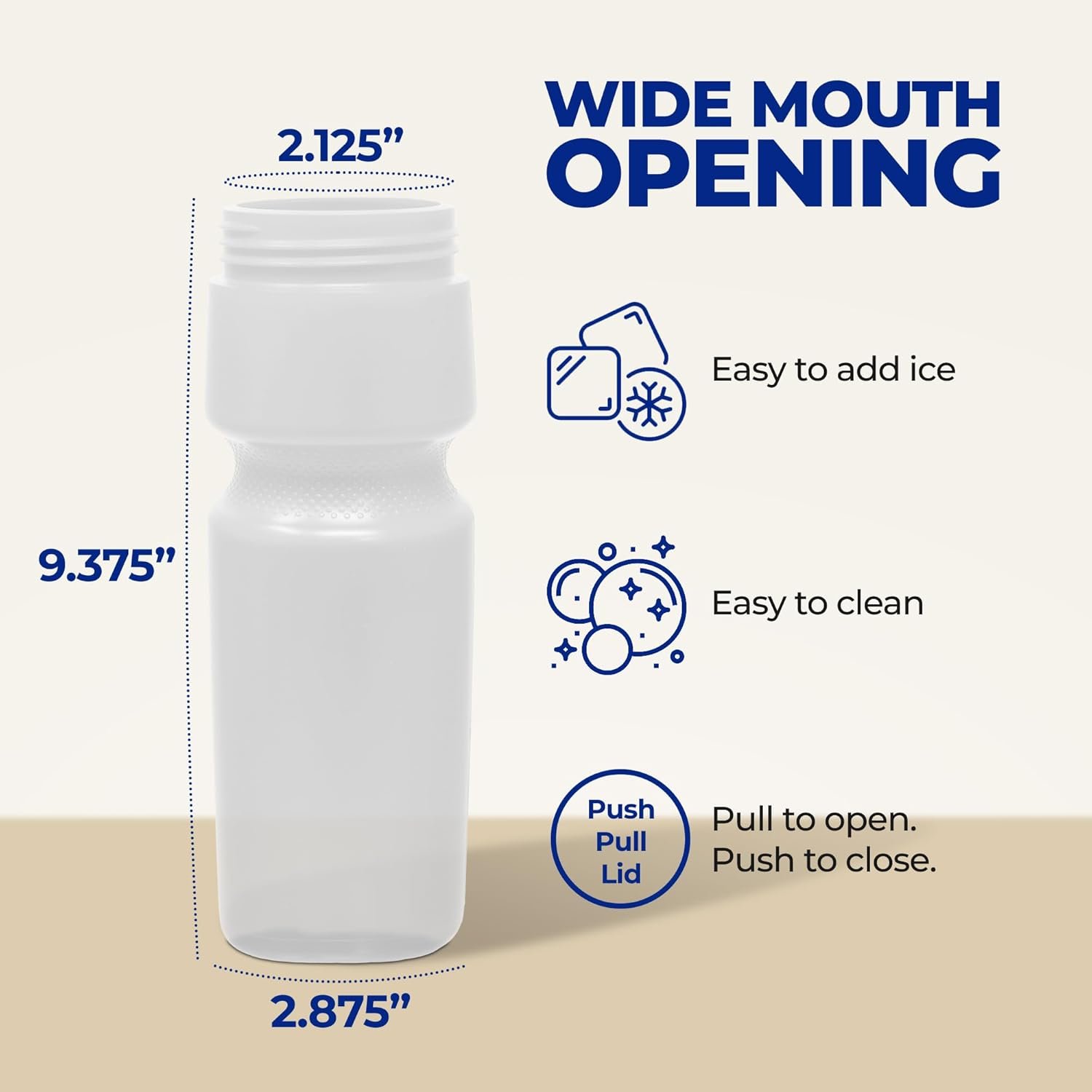 Easy Open Spout: Designed for convenience, the push pull top allows quick access to your drink. Stay refreshed with this user-friendly feature. Wide Mouth bottle opening to drop in regular size ice cubes. Made with easy squeeze LDPE plastic. Fit most bike cages and car cup holders. These bike bottles are lightweight at 2.4oz each.