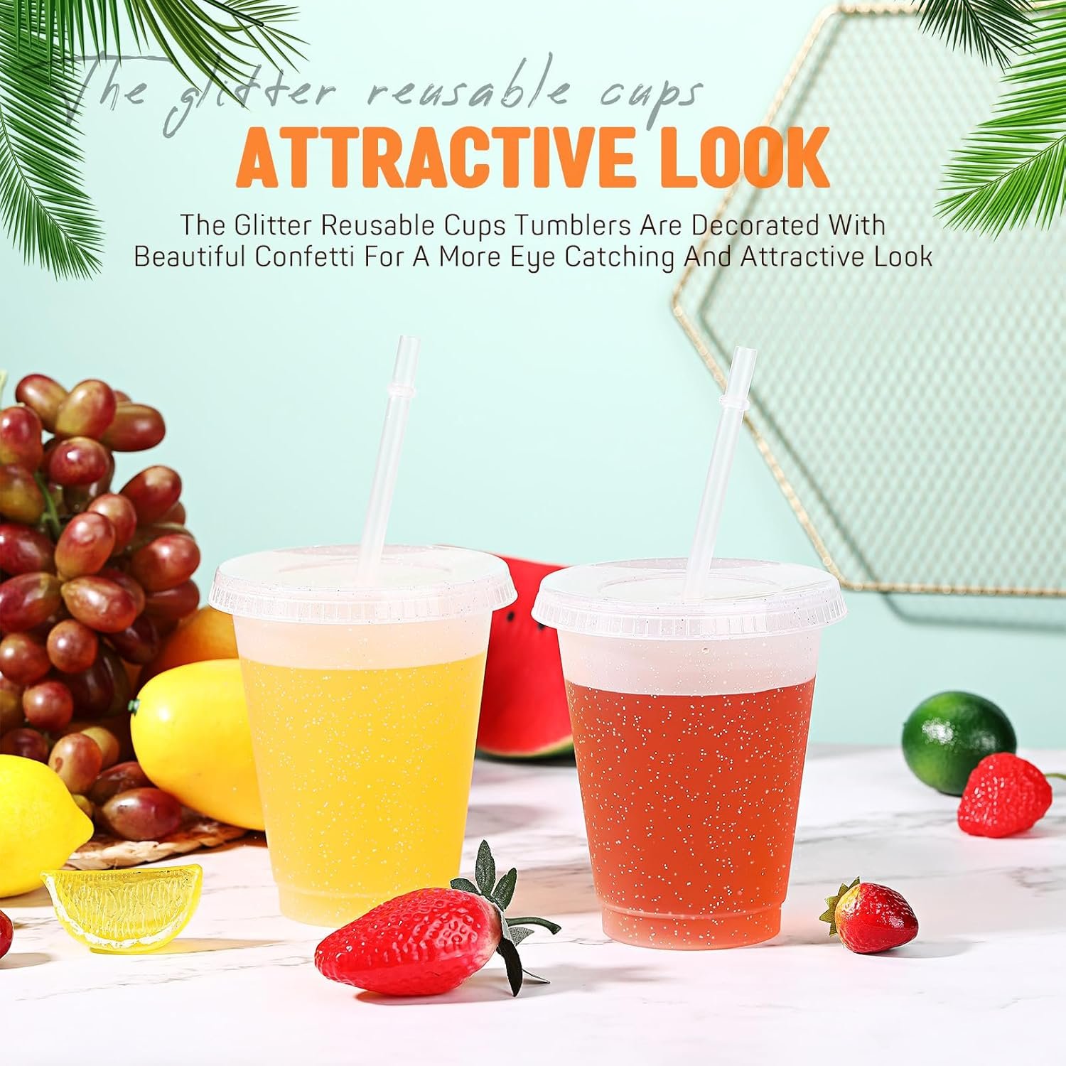 Glitter and Portable Design: the surface of the plastic tumblers with lids have fine flickered, which will shimmer under the light, attracting people’s attention very much; In addition, these plastic coffee cups have lids, which are very convenient for you to carry when you go out