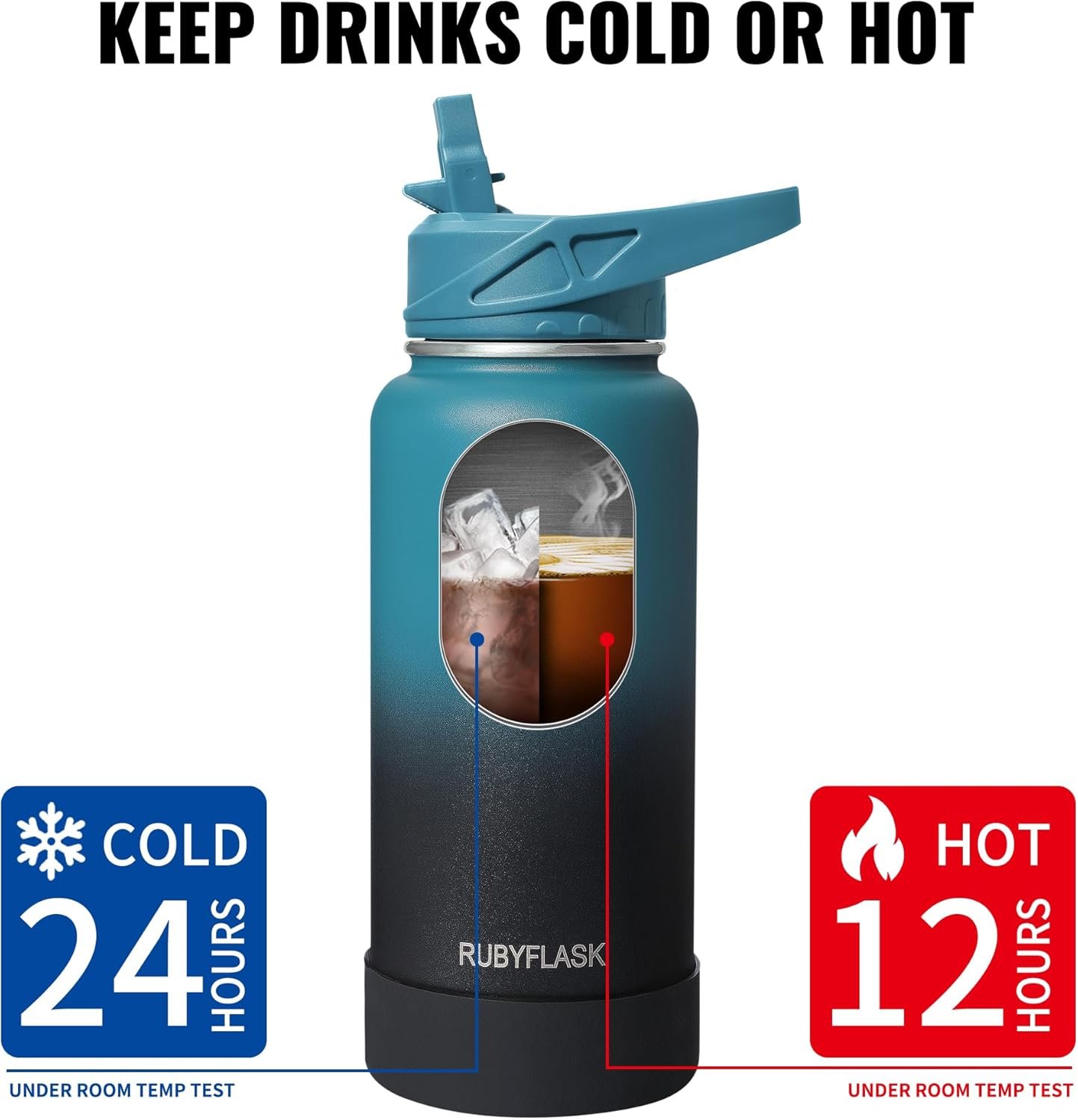INSULATED WATER BOTTLE: Food-grade stainless steel water bottle with double-wall vacuum insulation technology, keeps drink HOT for up to 12 hours and COLD for up to 24 hours, allowing you to enjoy icy cold drinks after workouts or a cup of hot coffee in winter