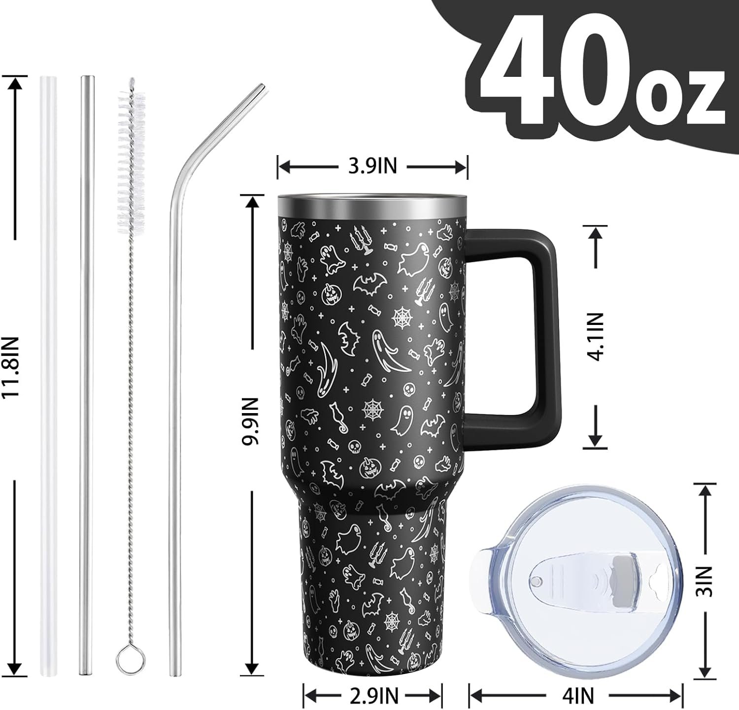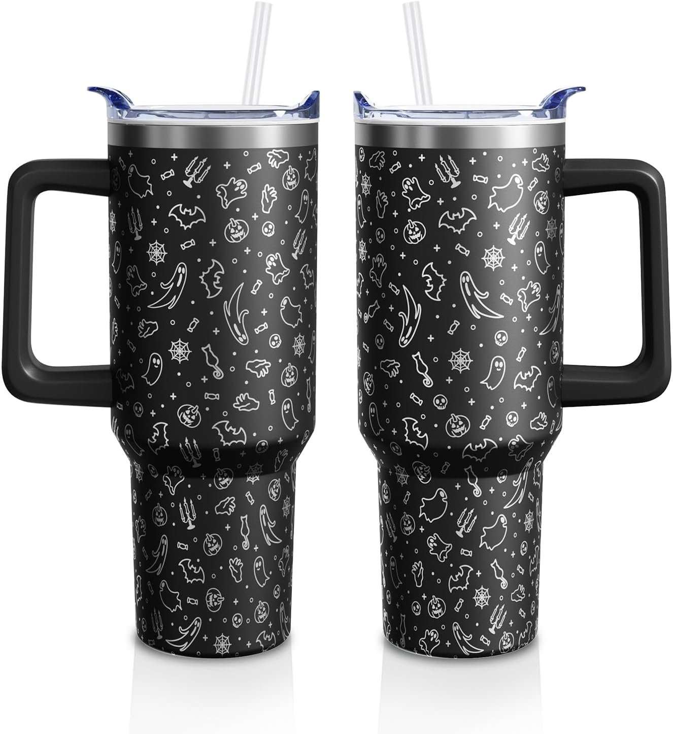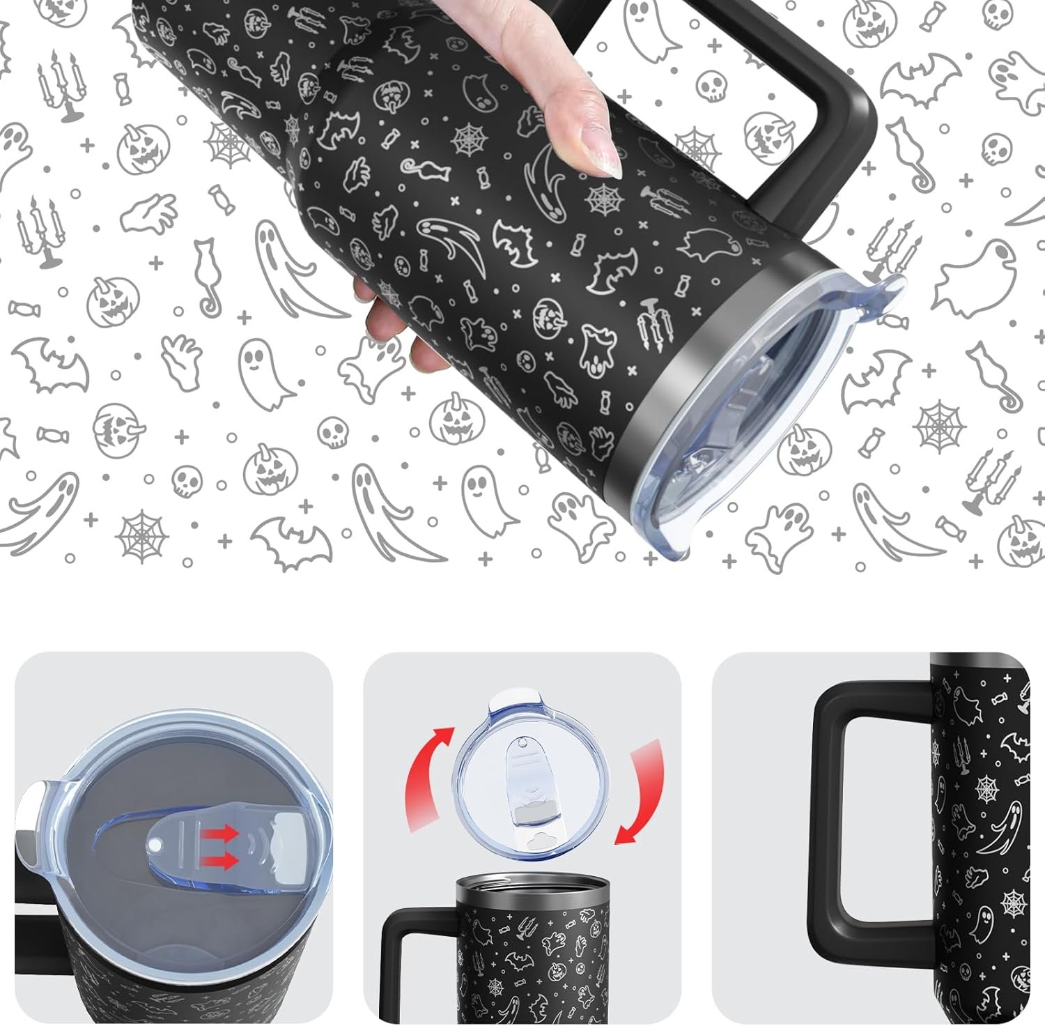 Sabobo Halloween Ghost Cup Gifts for Women Men, Spooky 40oz Tumbler with Handle and Straw, Holiday Black Engraved Stainless Steel Insulated Water Bottle (1 PC)