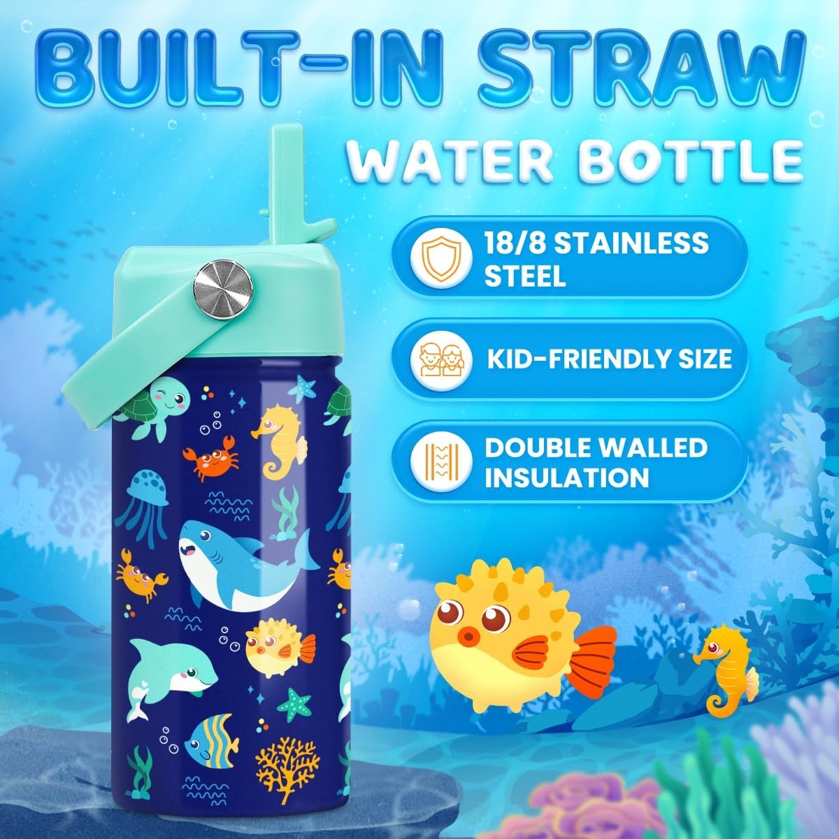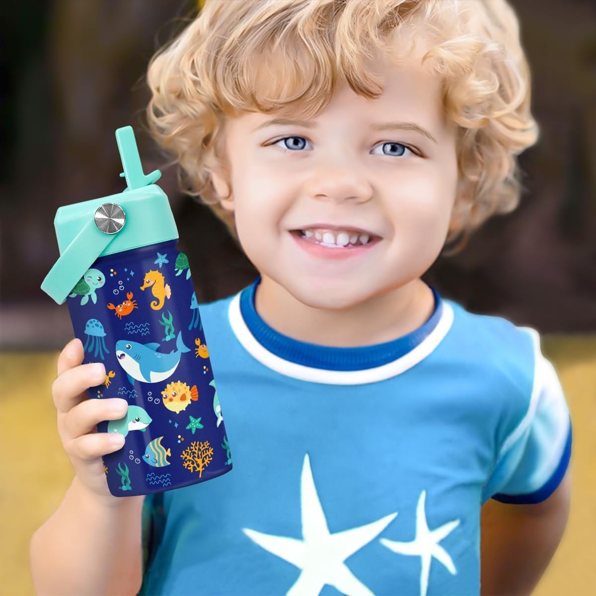 SANDJEST Kids Water Bottle with Straw Lid – 12 Oz Insulated Stainless Steel Ocean Water Bottles for Kid Boys Girls – Travel Cup for School Sports