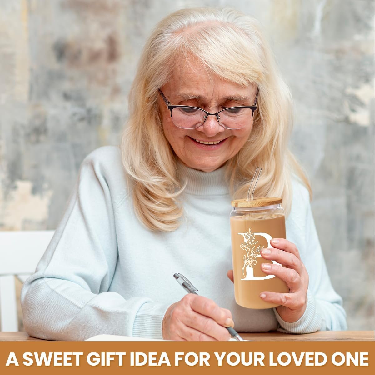 SANDJEST Monogrammed Gifts for Women – Monogram B Initial Glass Cup 16 Oz Can Coffee Cups with Lid and Straw – Monogram Initials Gifts for Womens on Birthday
