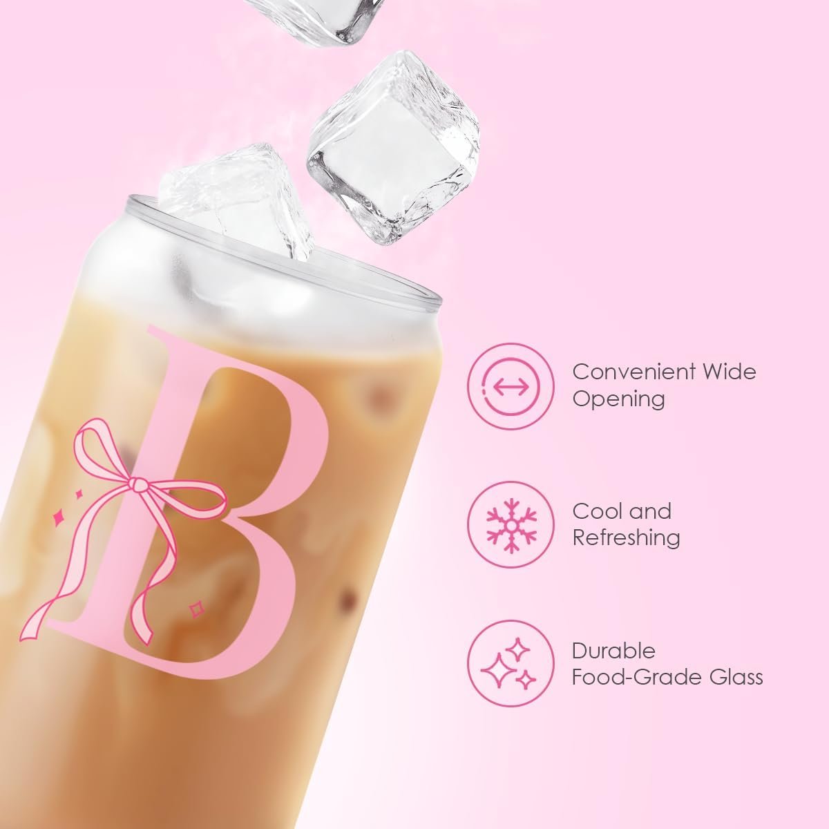 SANDJEST Monogrammed Glass Drinking Can Cup with Acrylic Lid and Straw, Personalized Frosted Iced Coffee Tumbler 16oz, Monogram Initial Gifts for Women Girls on Birthday (B)