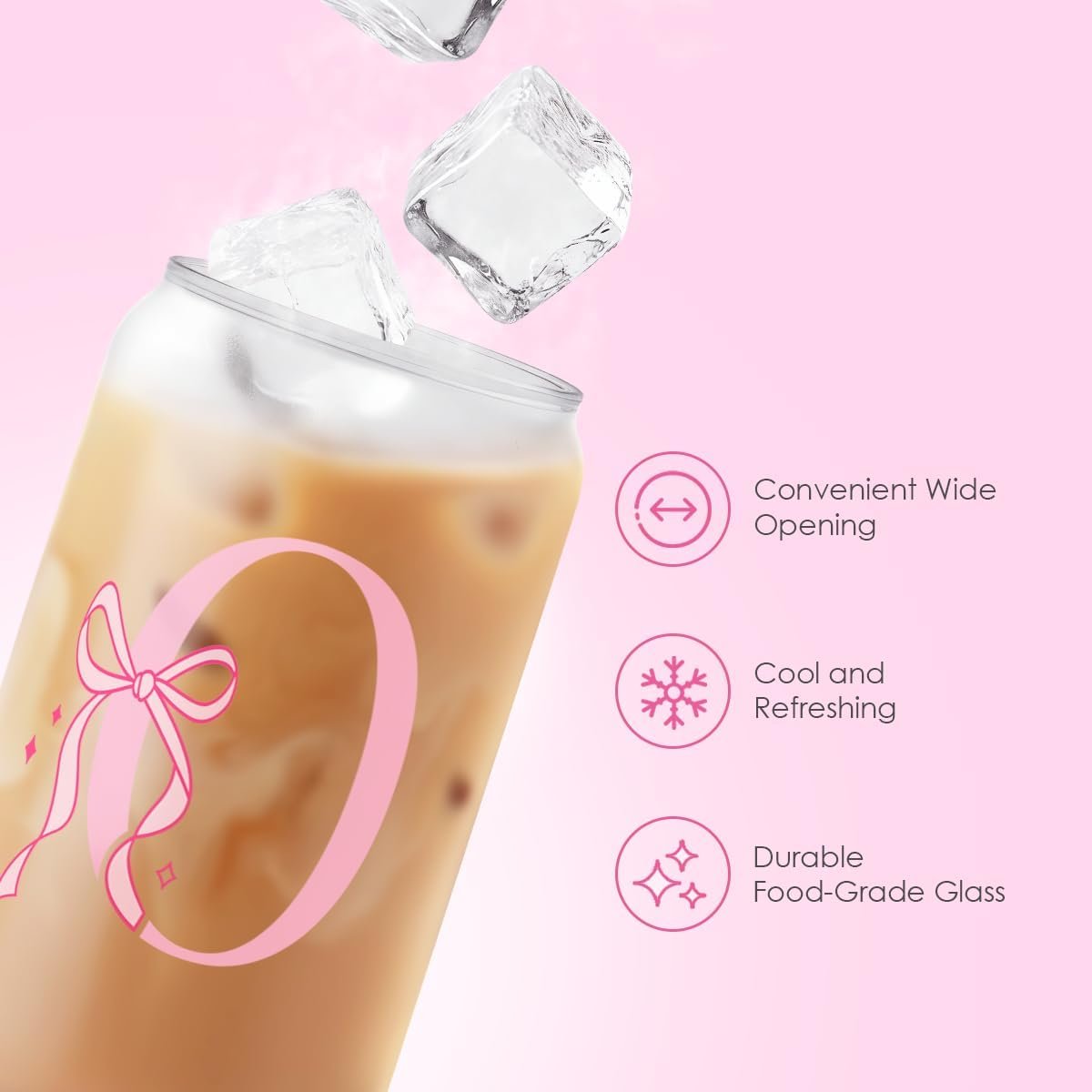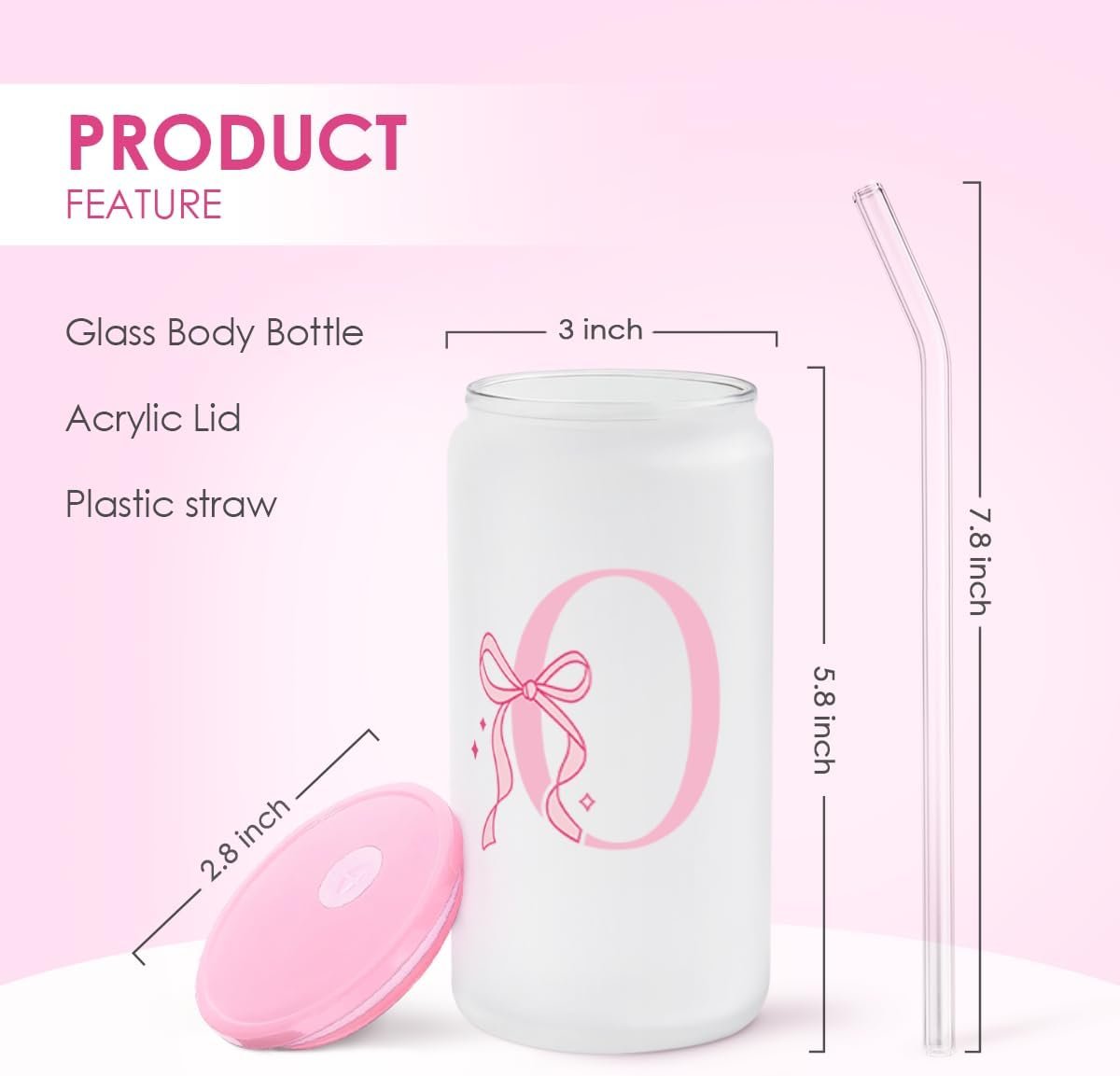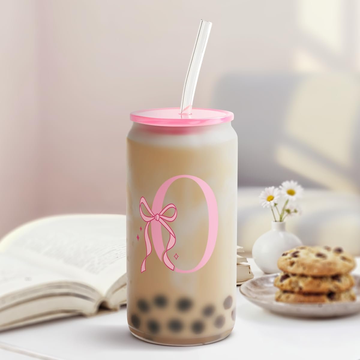SANDJEST Monogrammed Glass Drinking Can Cup with Acrylic Lid and Straw, Personalized Frosted Iced Coffee Tumbler 16oz, Monogram Initial Gifts for Women Girls on Birthday (O)