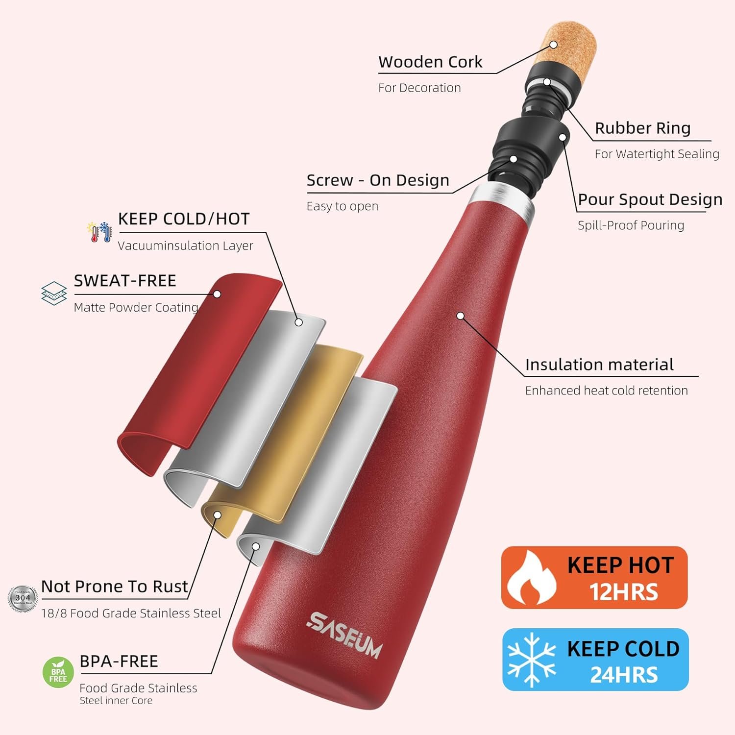 SASEUM Wine Bottle, 32 oz Insulated Stainless Steel Water Bottle and Wine Decanter with Vacuum Sealed Lid – Red 32 oz (1000ml)