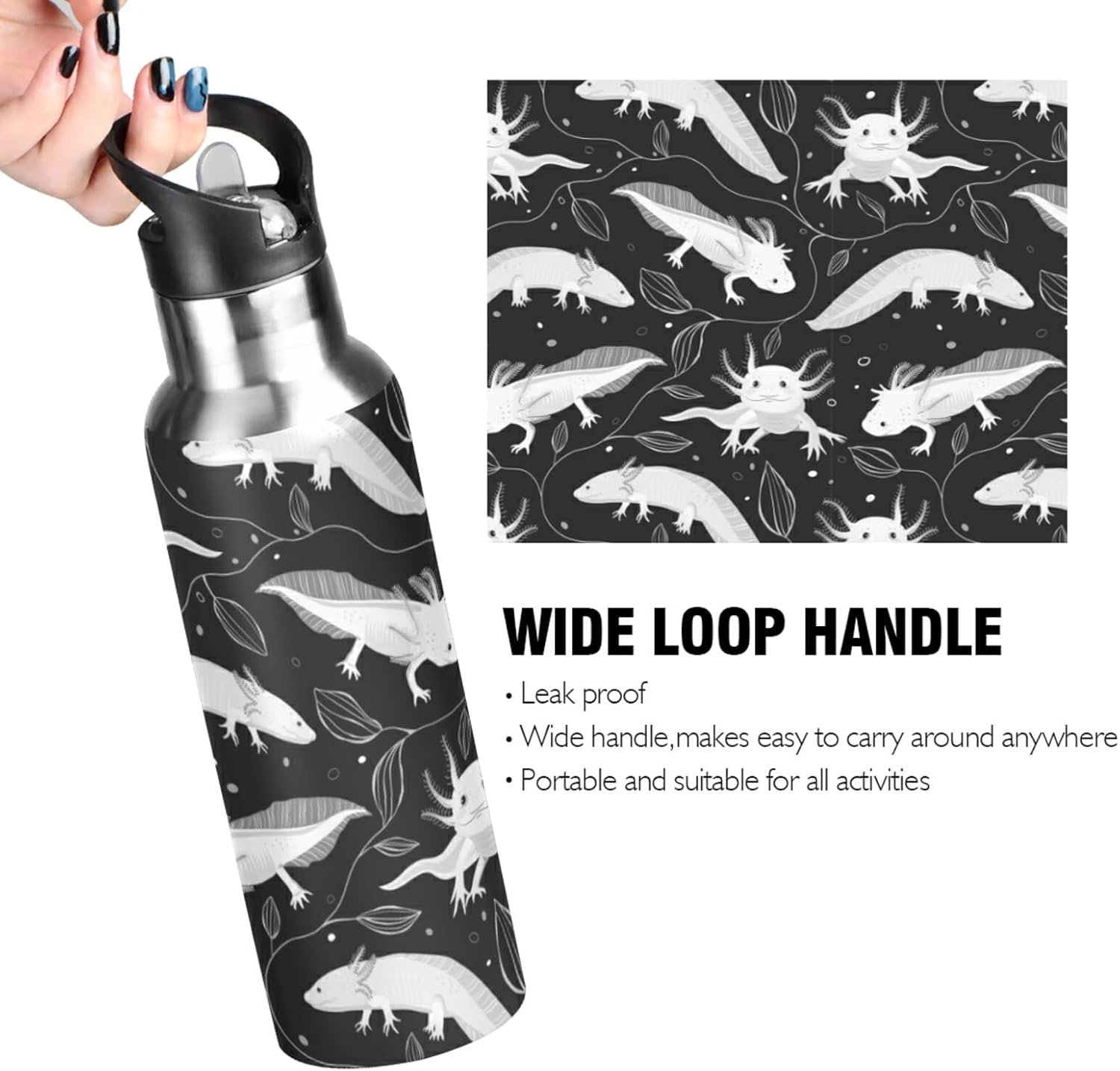 Seamless White Swimming Axolotls, Algae Leaves on Dark Stainless Steel Water Bottle, Leak-Proof Vacuum Hot Cold Insulated Travel Mug, Double Walled with Handle Thermo Cup Bottle 20 Oz