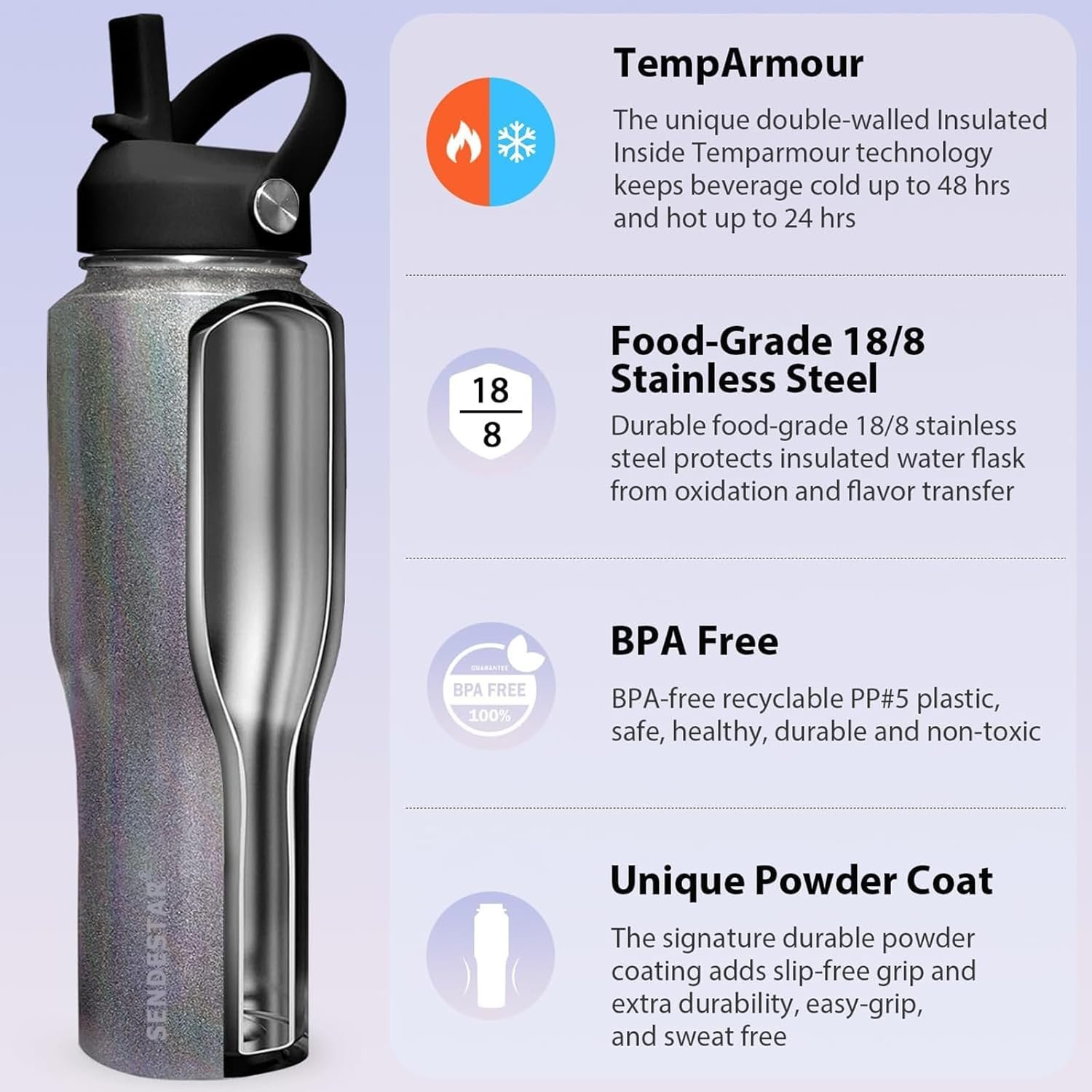 【VACUUM INSULATED】 Unique technology inside SENDESTAR 40oz water bottle keeps cold drink icy for up to 48 hours and hot beverage steaming up to 24 hours, make sure your every sip is the feeling you want. Excellent leak proof sealing lid prevents leakage so that you can just grab and go.