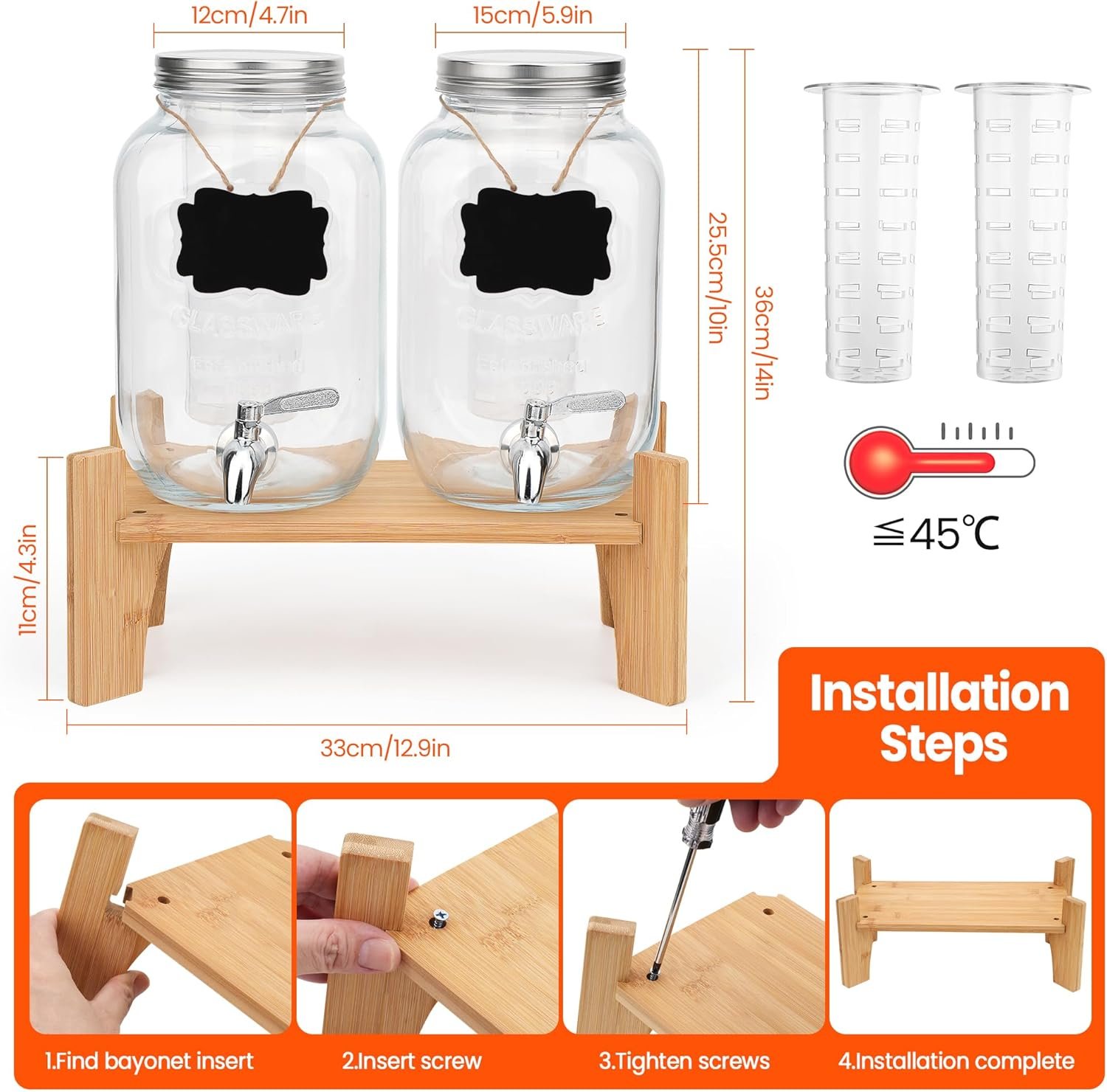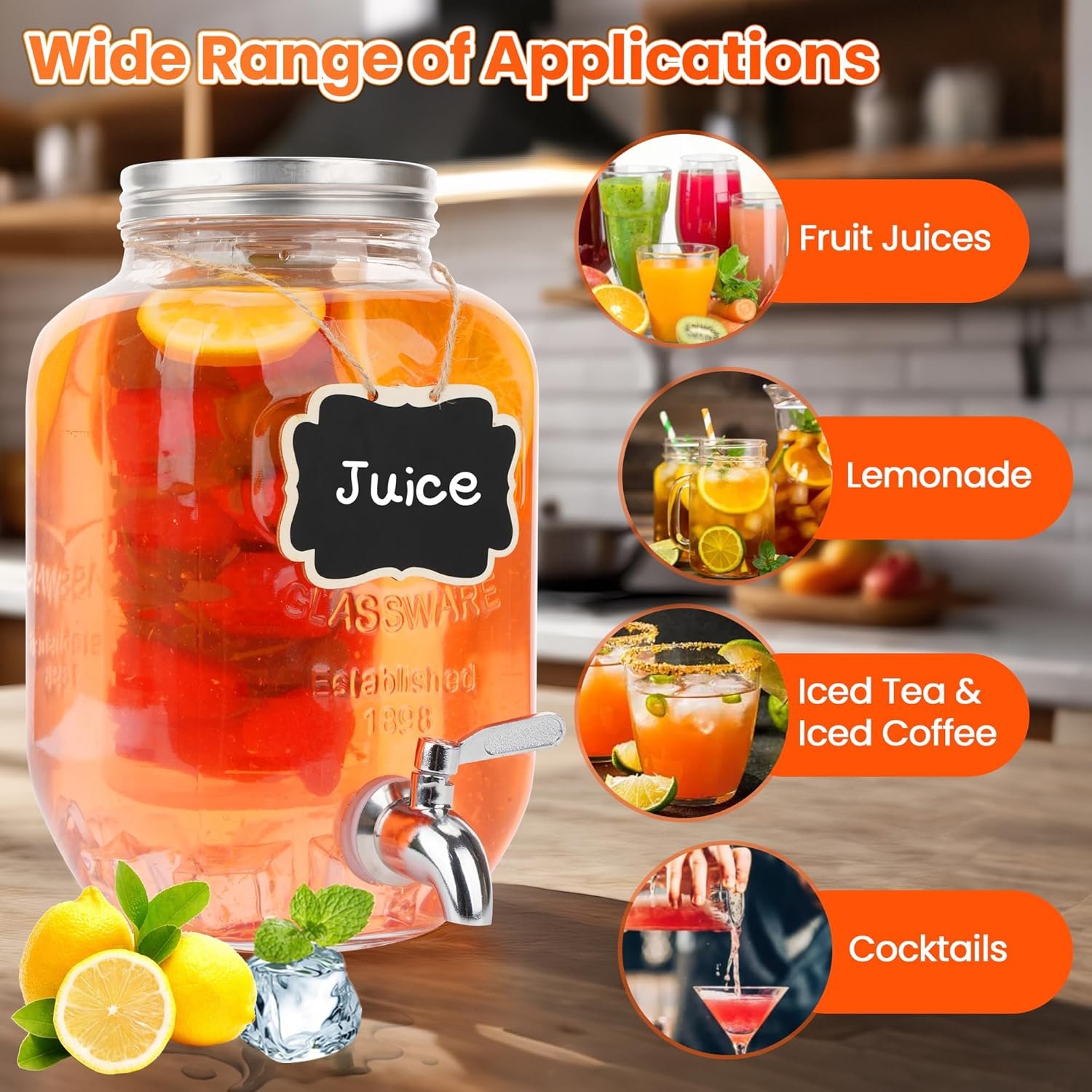 Easy to Clean & Maintain – Our Glass drink dispenser for fridge lids feature wide-mouth design, making them easy filling and cleaning. The wooden base can be wiped down (avoid prolonged soaking to preserve the wood).
