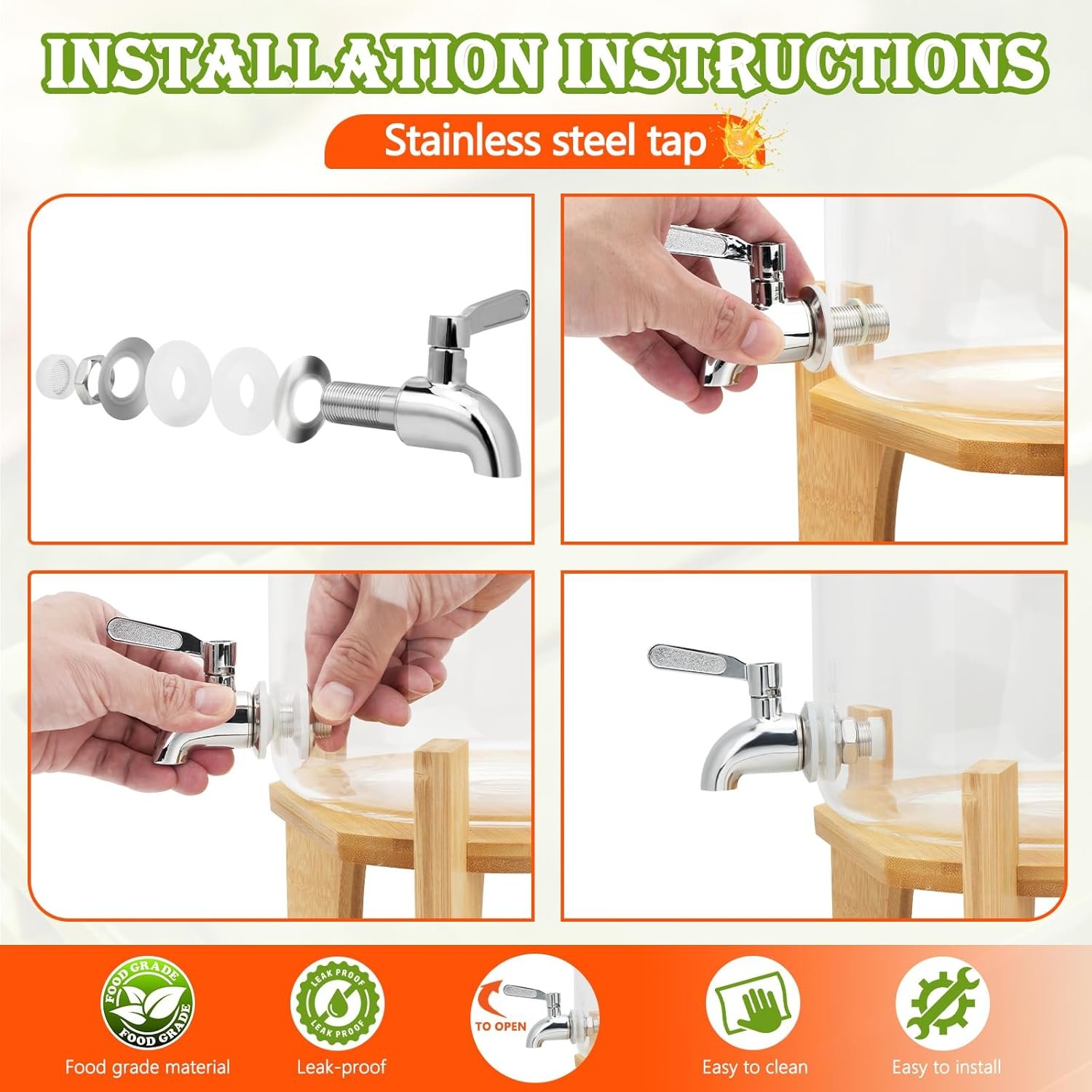 The embossed letters on the glass bottle add a vintage feel to the dispenser and can be used with any style of home. 304 stainless steel faucet is strong and durable, can be disassembled and replaced, wine or soda can be directly contacted 304 stainless steel, safe and harmless to people Bamboo wood stand at the four corners are stable and easy to install, and the dispenser is not easy to shake when placed on the brackets.