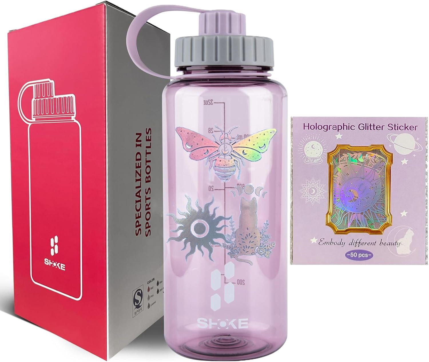 SHOKE Sport Water Bottle 1L 32oz Wide Mouth for Hicking (purple+50pcs stickers)