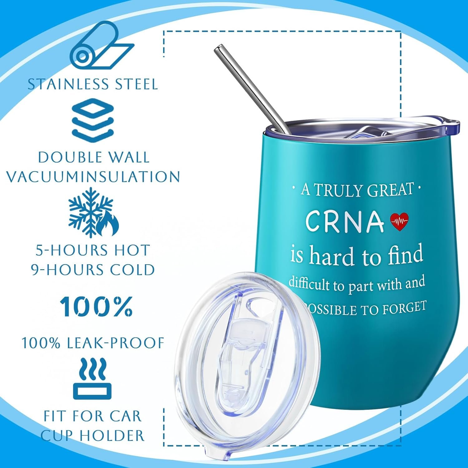 The 12 oz stainless steel tumbler with lid is compact and portable, enhancing our anesthesia crna gifts practicality for daily use like sipping during walks or work breaks.