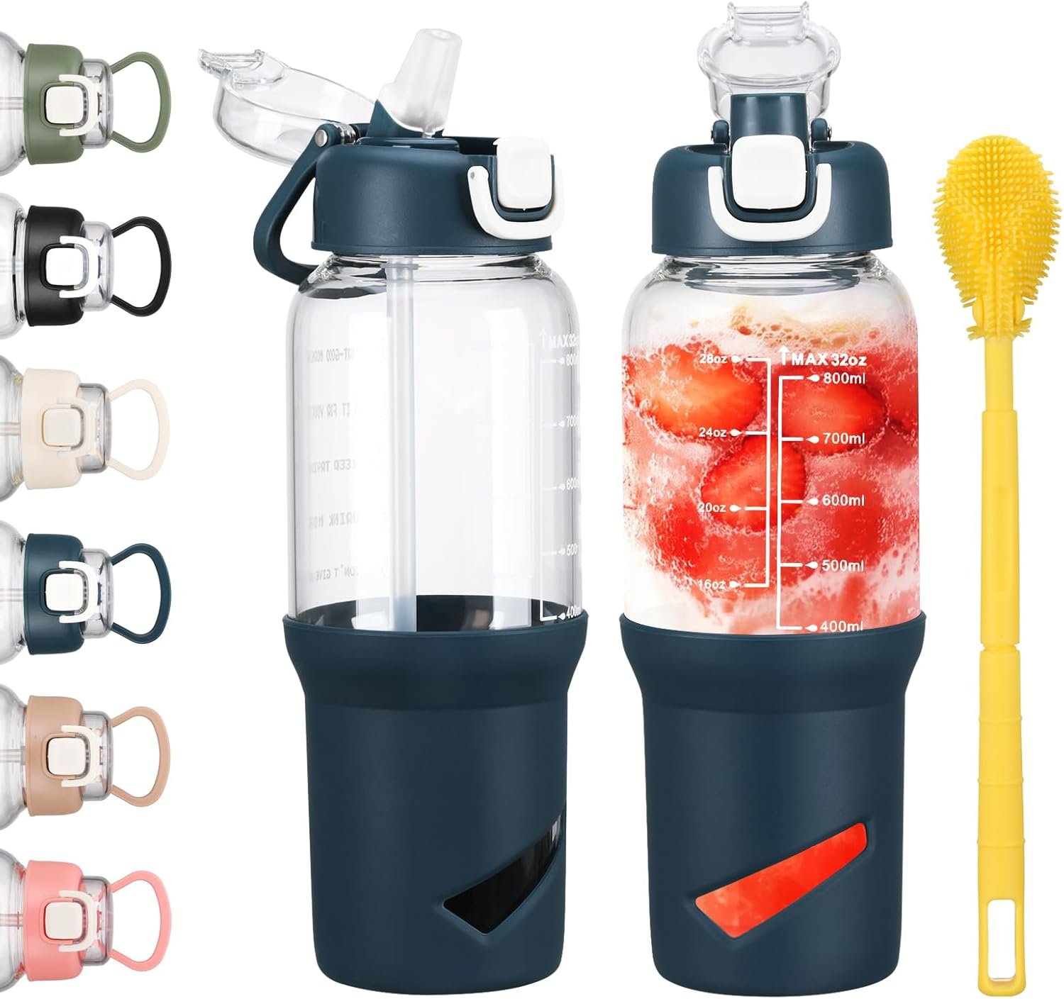 SIEROZUR 32 oz Glass Tumbler with Straw, Glass Water Bottles with 2 Lids-Handle Spout Lid & Straw Lid, 1 Liter Motivational Water Bottles, Silicone Sleeve, Fits Car Cup Holder,Dark Blue