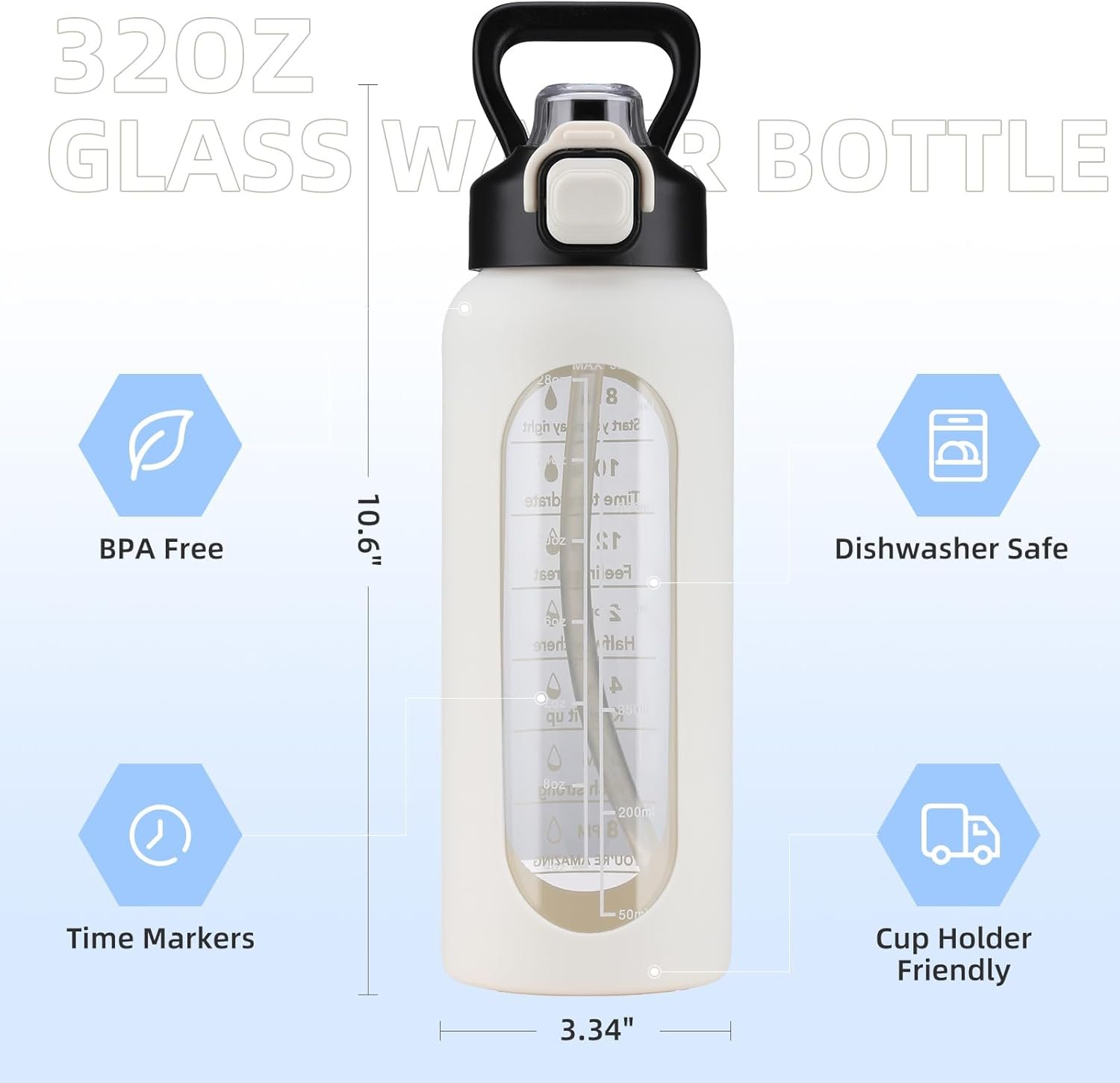 SIEROZUR 32 oz Glass Water Bottle with Straw and Handle, Leakproof Sports Glass Bottle with Time Marker, Water Jug with Silicone Sleeve for Gym, Travel, Workout, White