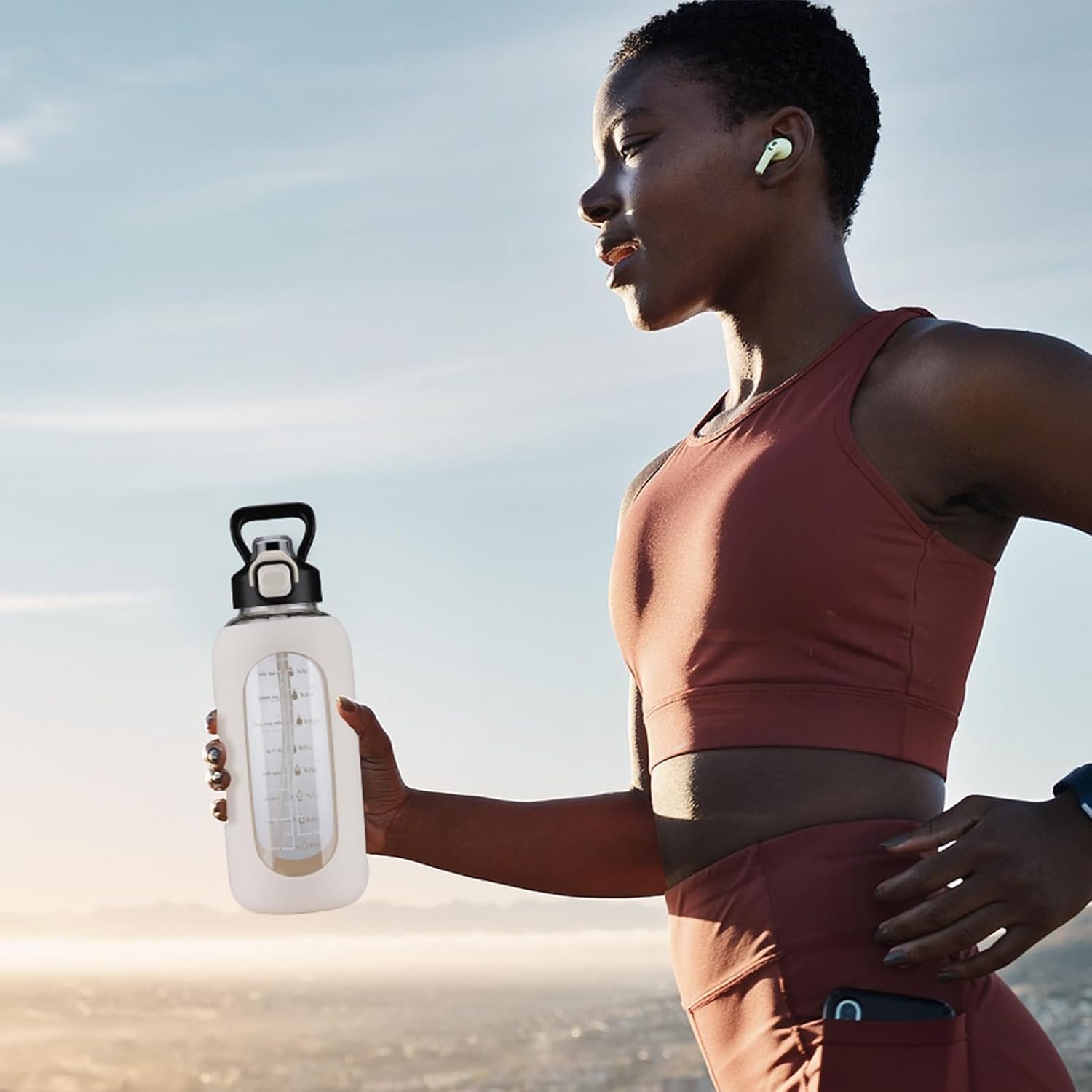 Easy To Carry: SIEROZUR motivational glass water bottles offer 32 oz or 64 oz to meet your different hydrating needs for the whole day, top with handle design, and a non-slip silicone sleeve to avoid hand slippage or slight bump, perfect for at home or office, working out, outdoors, travel, gym, yoga