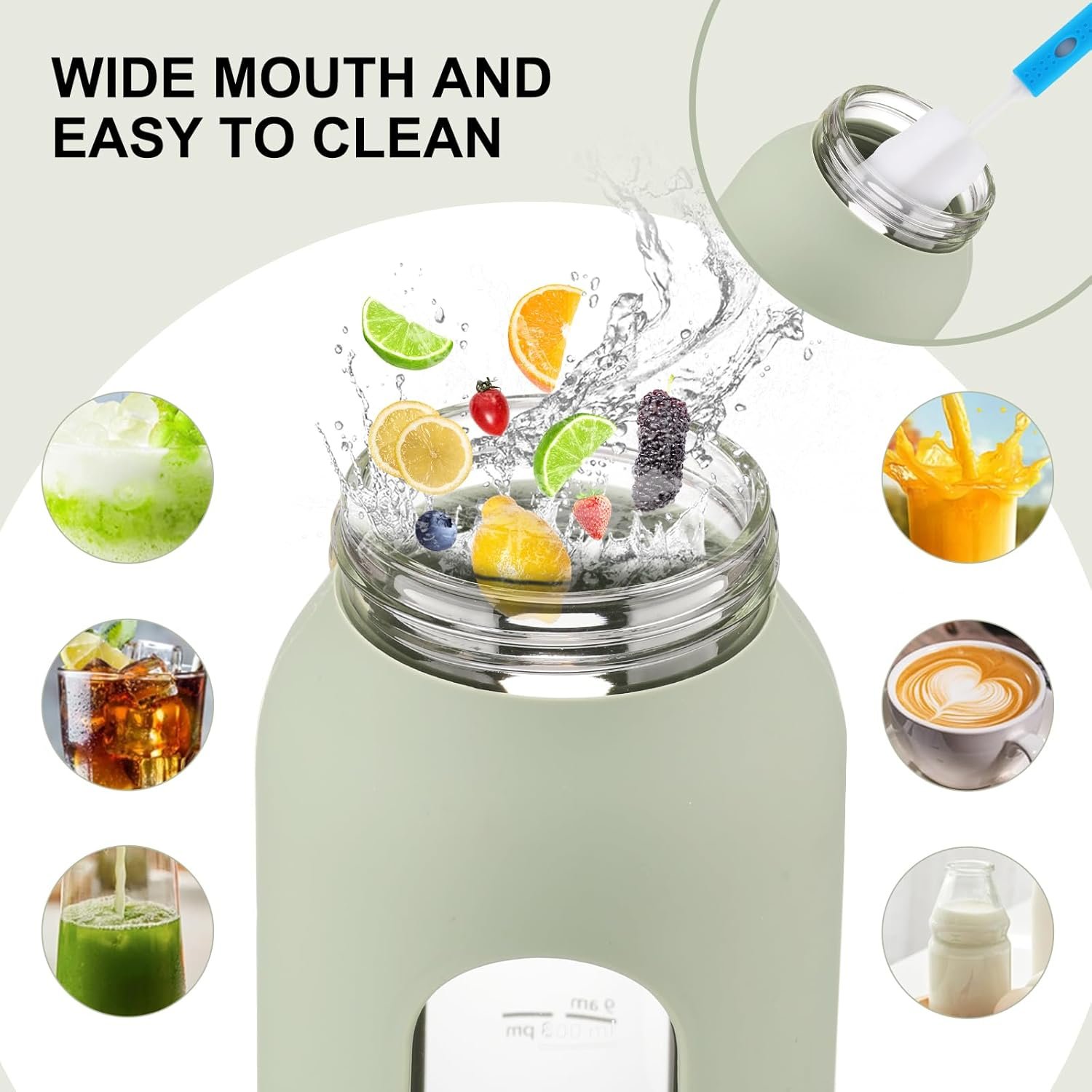 LARGE Mouth GLASS WATER BOTTLE: With a wide mouth opening, it is easy to fill with ice cubes and fruits and daily cleaning, which is dishwasher safe. Furthermore, the 32oz thicker base of our glass water bottles provides exceptional breakage resistance