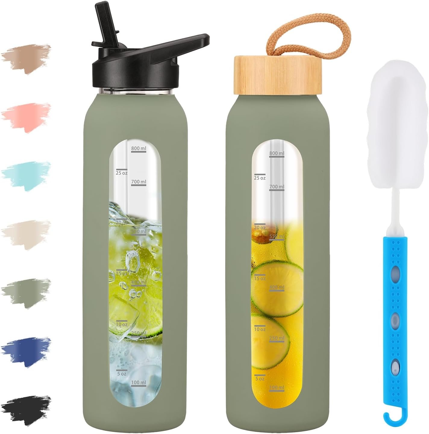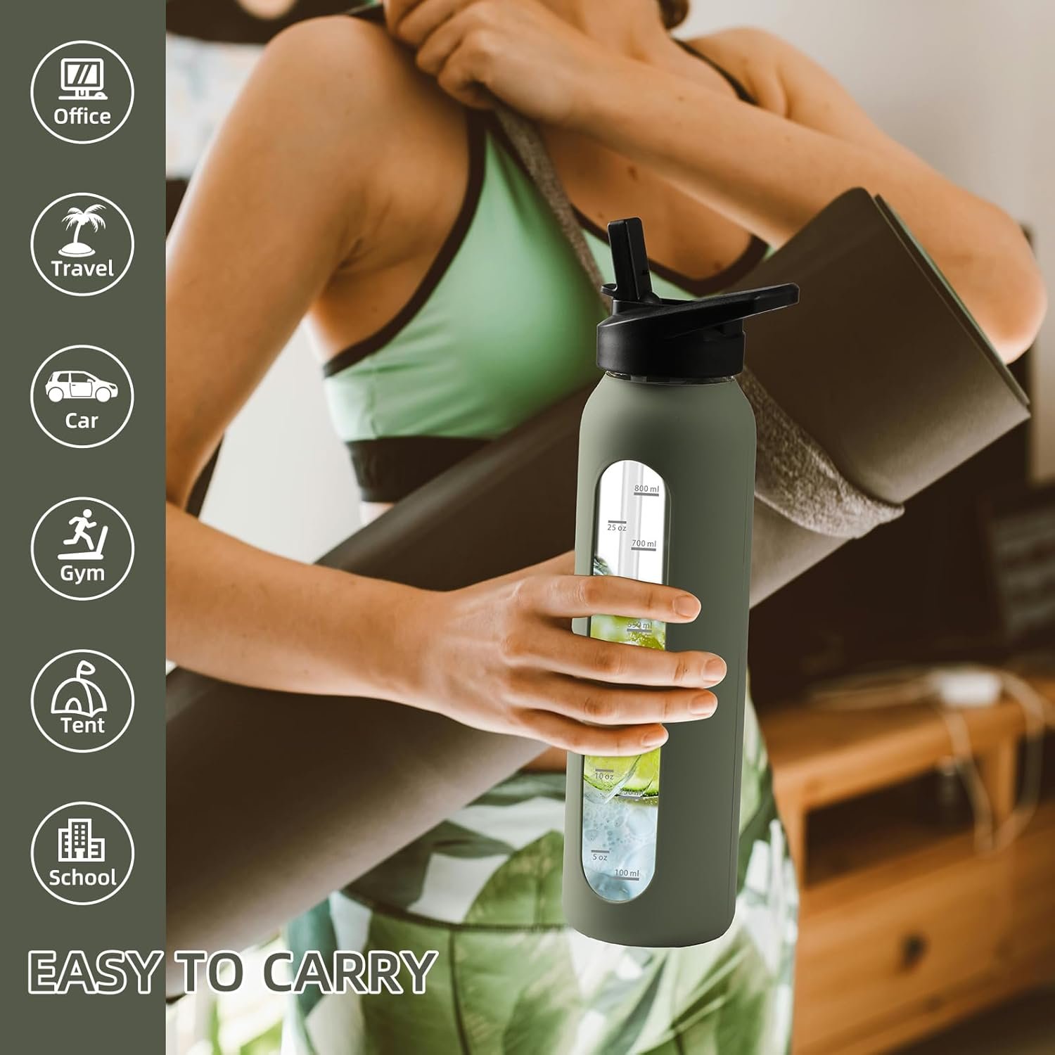 PART HYDRATION AND TIME MARKER DESIGN: 32oz glass water bottle with time marker keeps the purity of water. The aesthetic glass water bottle reminds you to achieve your drinking goals all day. Large capacity, let you not refill it frequently. Helps you stay hydrated and daily health