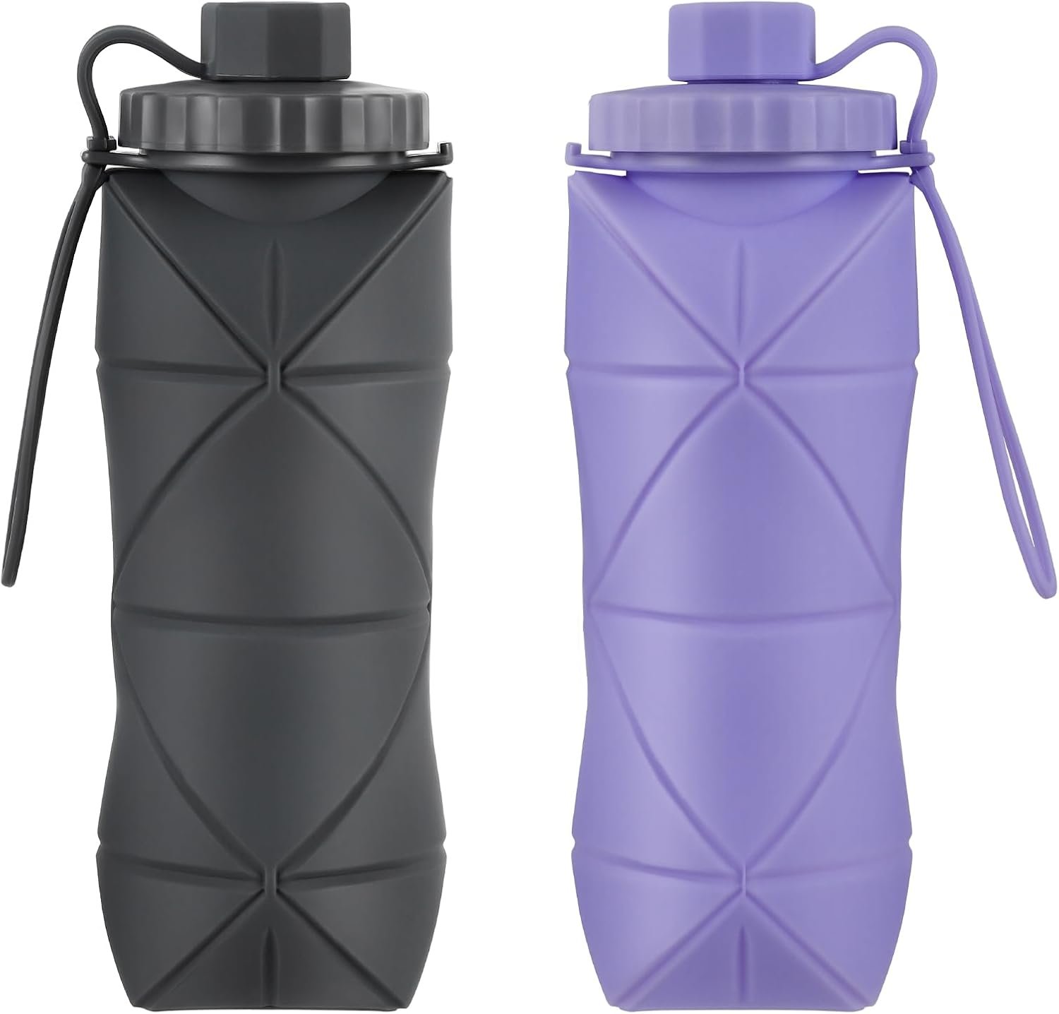 Silicone Collapsible Water Bottles,Lightweight Reusable Leakproof For Traveling Camping Hiking Cycling Sports Outdoor,Foldable Portable Travel Water Bottle 600ML Dark Grey And Purple 2Pack.