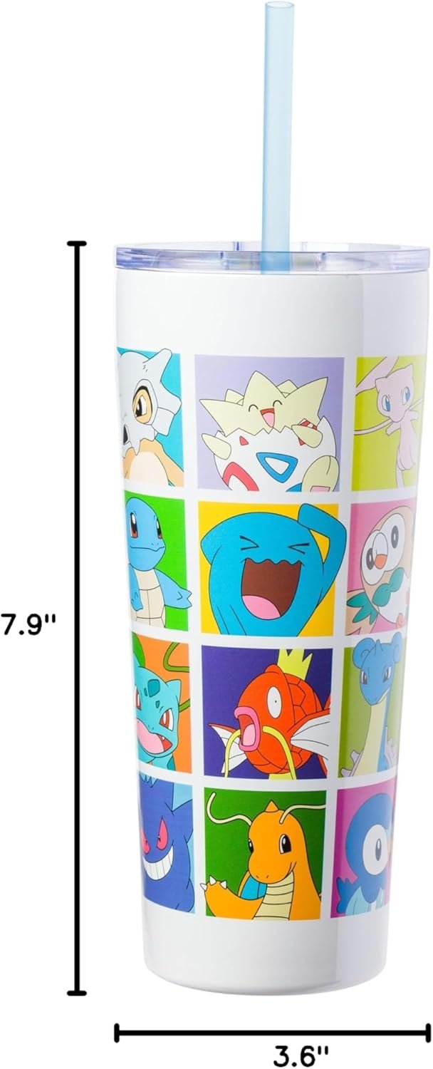 DOUBLE-WALLED STAINLESS-STEEL TUMBLER: Enjoy your favorite beverage at home or go in this awesome Pokemon 22oz. Double Walled Stainless Steel Tumbler with Straw. Featuring all of your favorite Pokemon characters in a grid against a White background