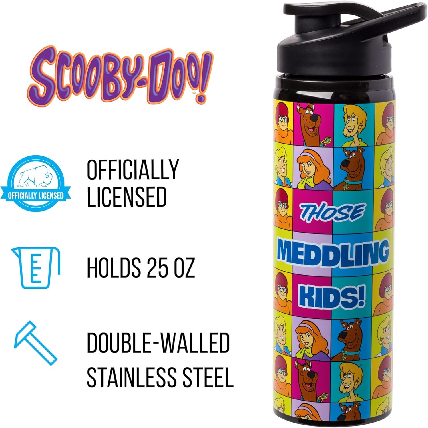 Silver Buffalo Scooby-Doo “Those Meddling Kids!” Stainless Steel Water Bottle Featuring Scooby-Doo, Fred, Velma, Shaggy, and Daphne, 25 Ounces