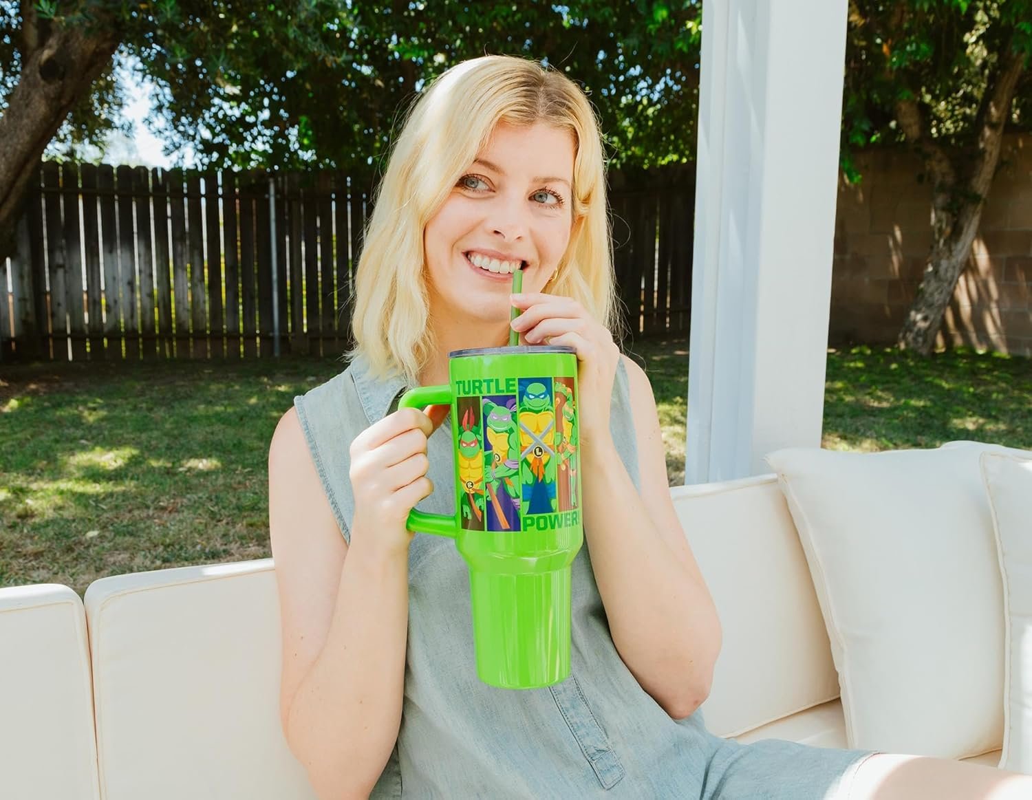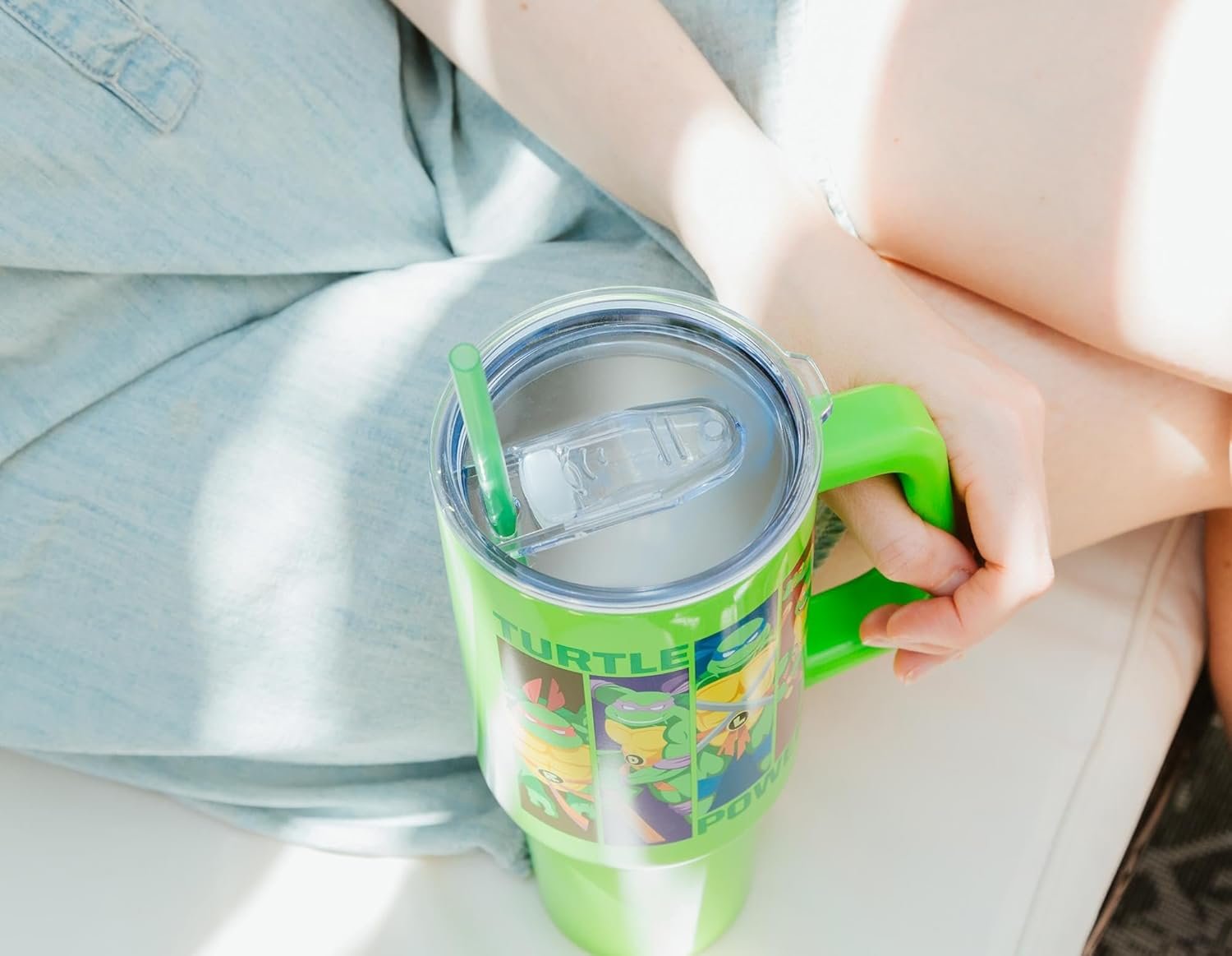 Silver Buffalo Teenage Mutant Ninja Turtles Turtle Power Stainless Steel Tumbler with Handle Featuring Leonardo, Donatello, Raphael, and Michelangelo, Fits in Standard Cup Holder, 40 Ounces
