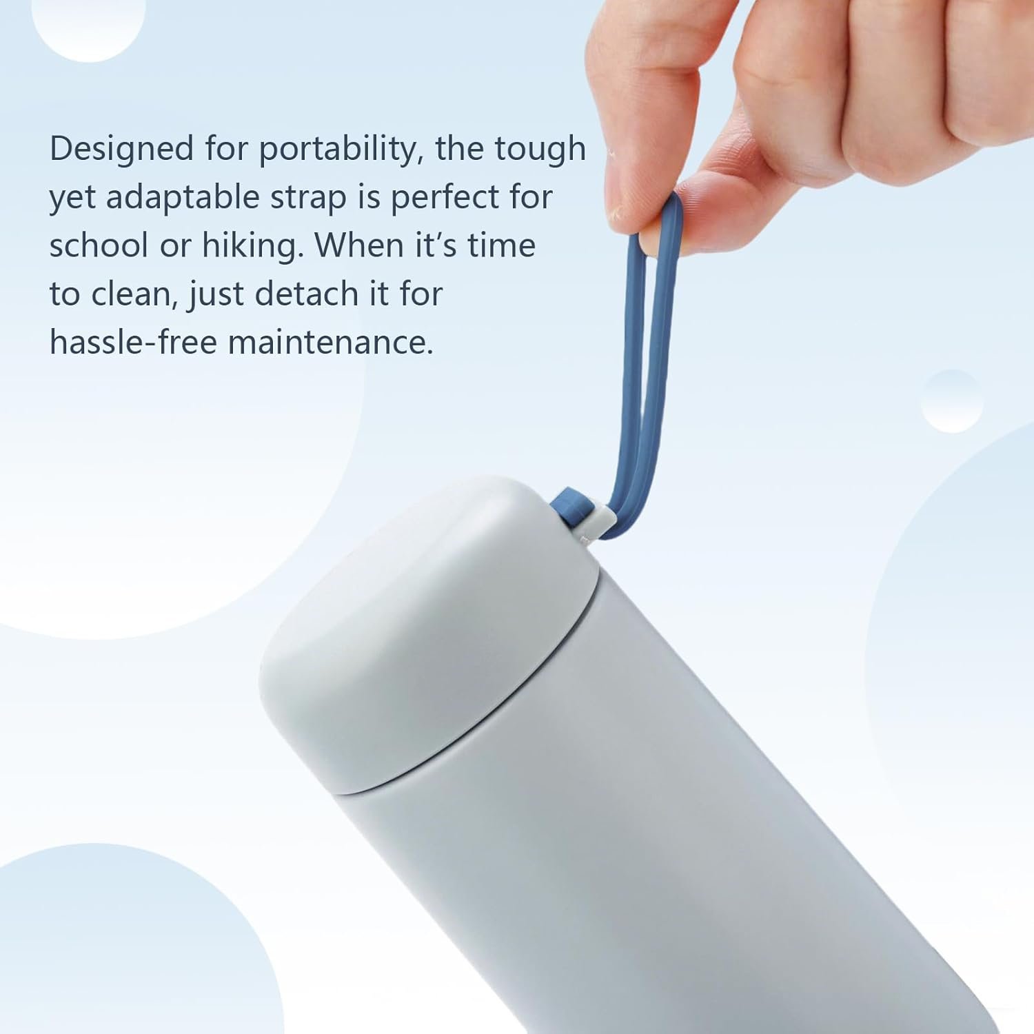 COMPACT & PORTABLE: Slim 14×6.5cm size (5cm wide mouth) fits cup holders and bags effortlessly. The silicone carry handle adds convenience for on-the-go hydration.