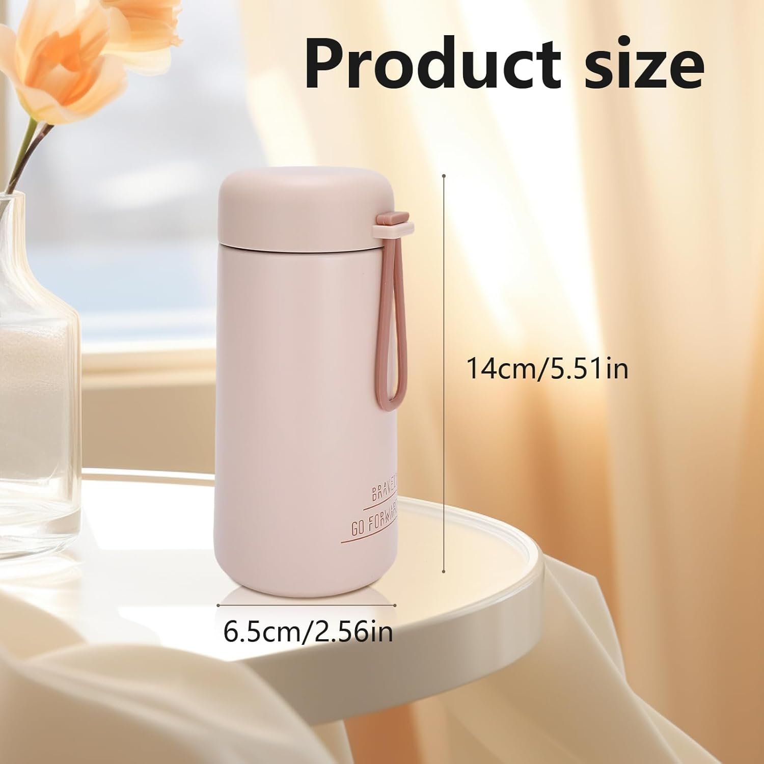 COMPACT & PORTABLE: Slim 14×6.5cm size (5cm wide mouth) fits cup holders and bags effortlessly. The silicone carry handle adds convenience for on-the-go hydration.