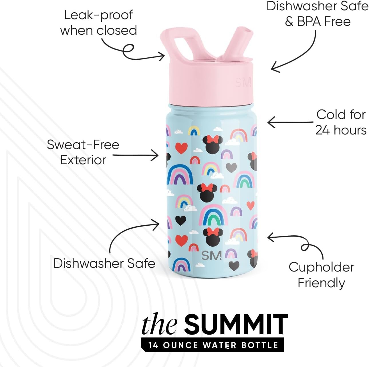 Simple Modern Kids Summit Water Bottle with Straw Lid | Disney Minnie Mouse 14oz Stainless Steel Cup Insulated Tumbler for Girls, School | Minnie Mouse Rainbows