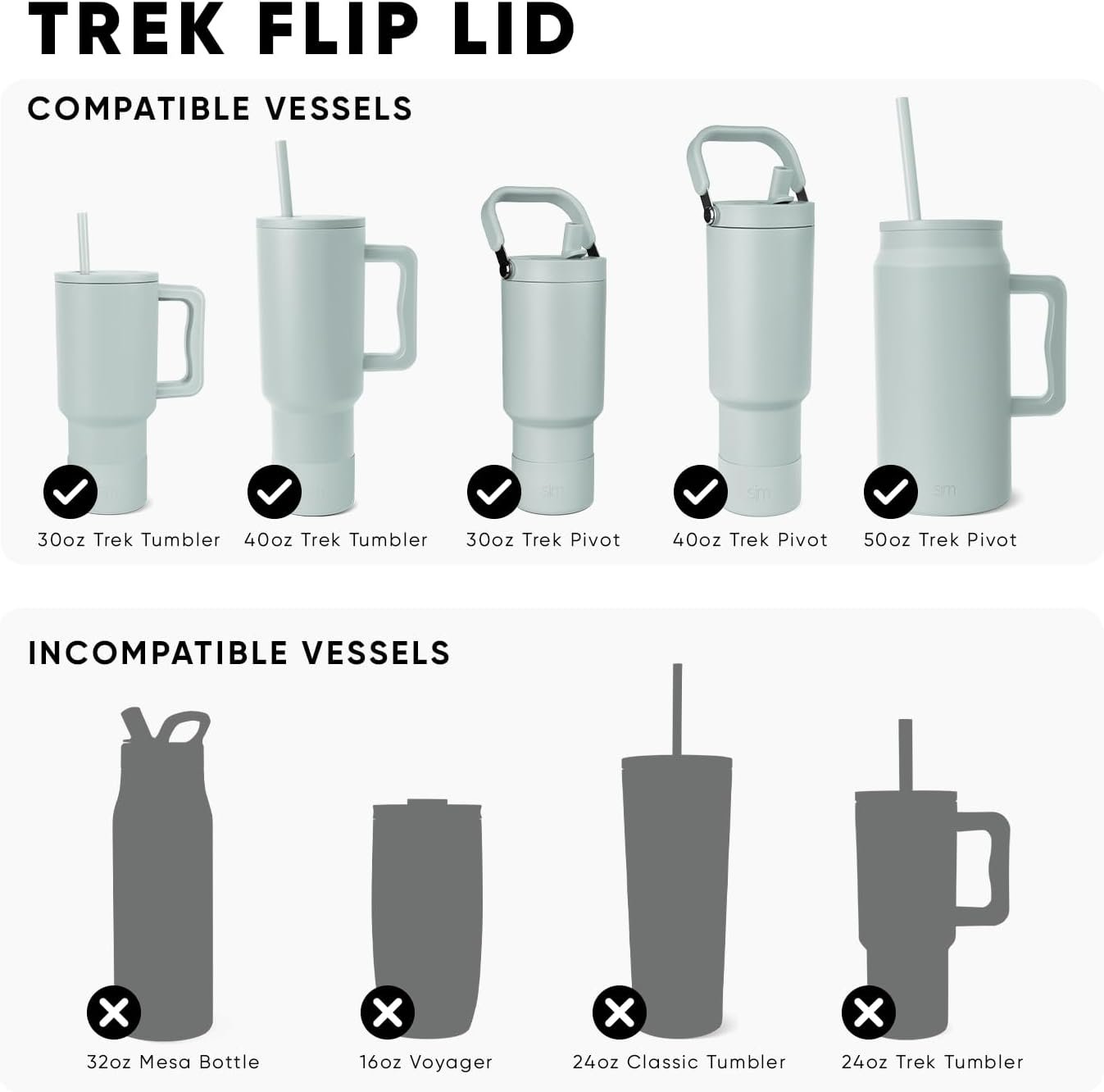 This reusable flip lid is designed to fit only threaded, stainless steel Simple Modern vessels in the Trek Collection. This lid does not fit the Simple Modern Voyager, Cruiser, Slim Cruiser, Classic, or any other brand of drinkware.