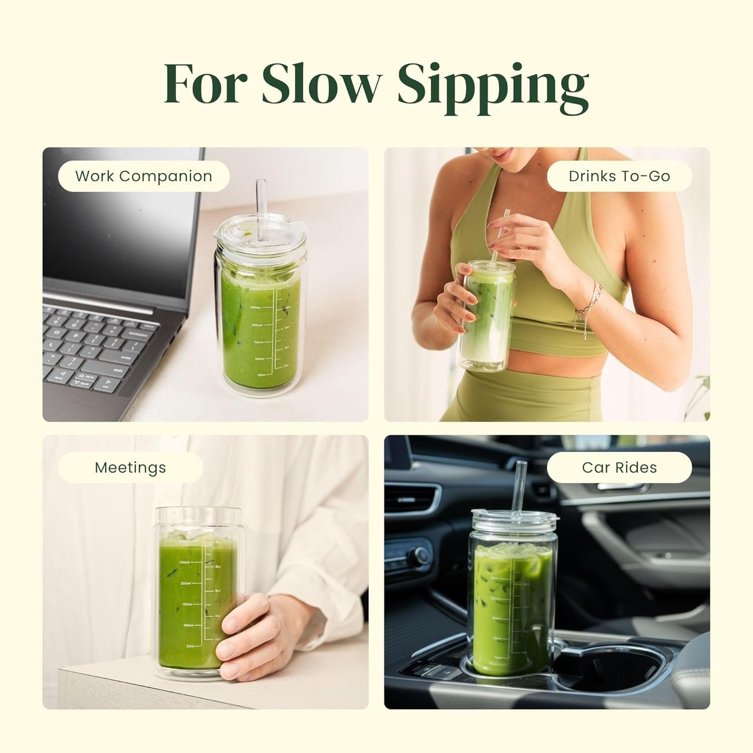 Slow Sippin’ Glass Tumbler with Straw & Lid – 11.8oz / 350ml Double-Walled Glass Coffee Cup, Matcha Cup with Volume Markings, Tritan® Straw & Cleaner – Reusable, BPA-Free Iced Coffee Tumbler
