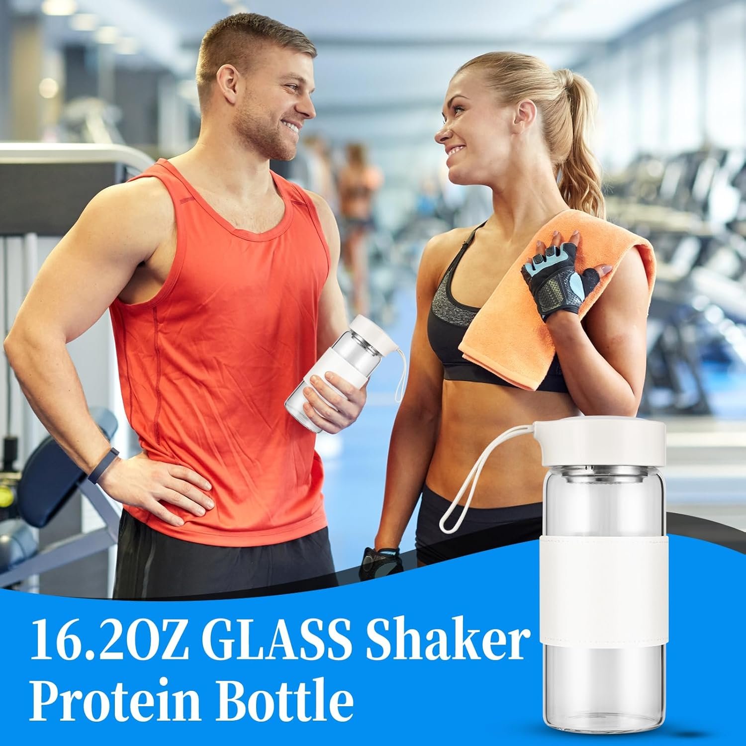 Small Glass Shaker Bottle, 2 Pack 16oz BPA Free Odorless Shaker Bottle with 304SS Mixing Ball and Removable Cleaning Brush for Fitness & Protein Shakes(White-2Pack)