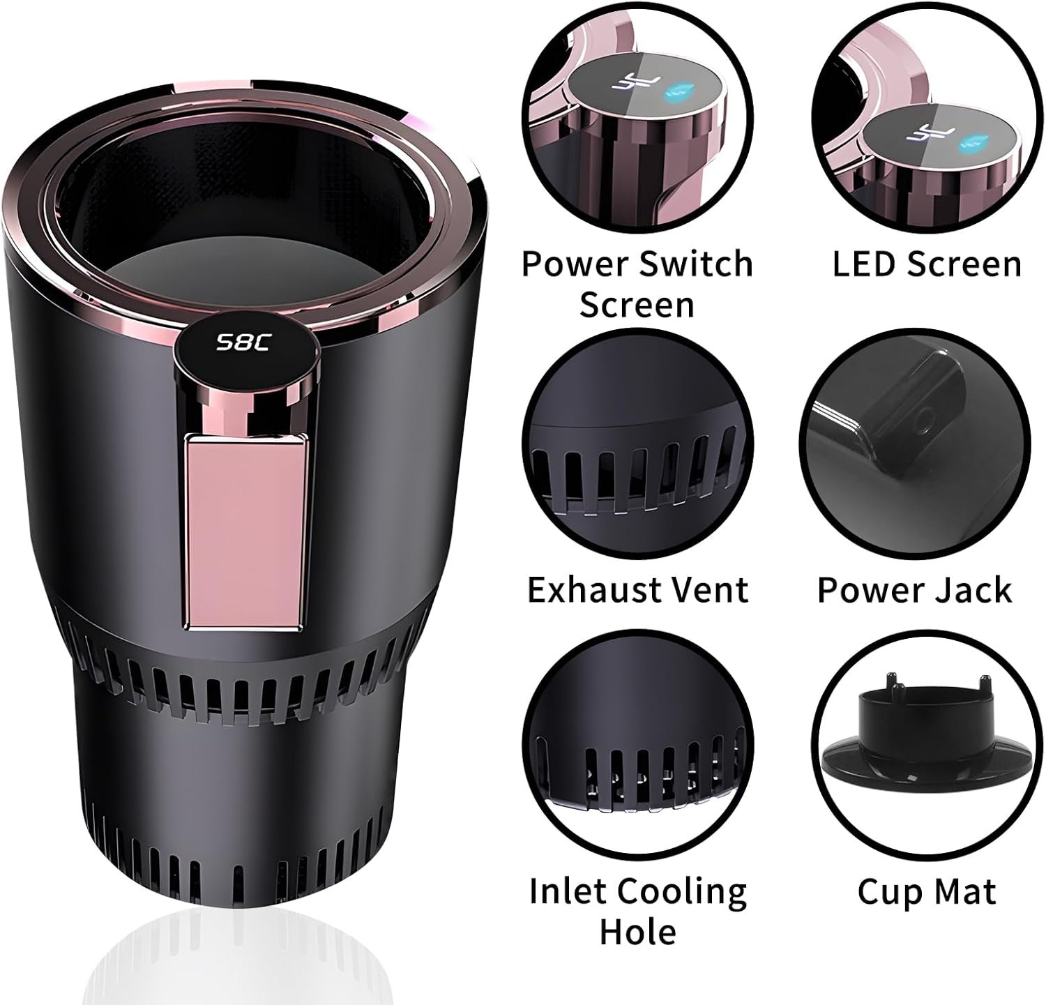 2-IN-1 Intelligent Cup Holder: Let the car intelligent cup holder cool or heat your drinks. Heating effect is 50~60℃; Cooling effect is 0℃~5℃, cool or heat your drinks in minutes, smart LCD screen shows the temperature.
