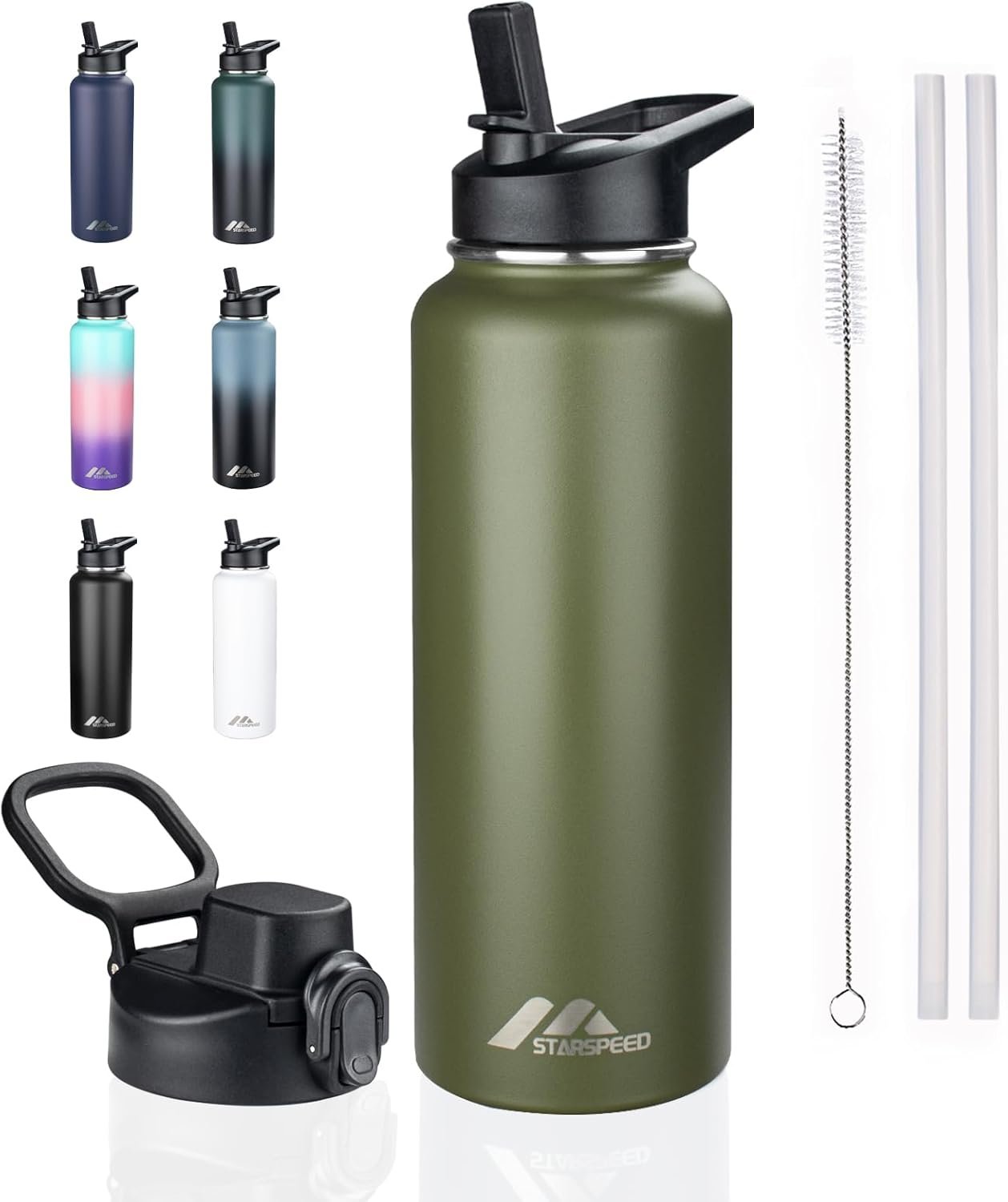 StarSpeed 40oz Insulated Water Bottle with Straws & 2 Lids, Stainless Steel Double Walled Vacuum Water Flask, Wide Mouth Sports Water Bottle for Gym Camping Hiking, Navy Green