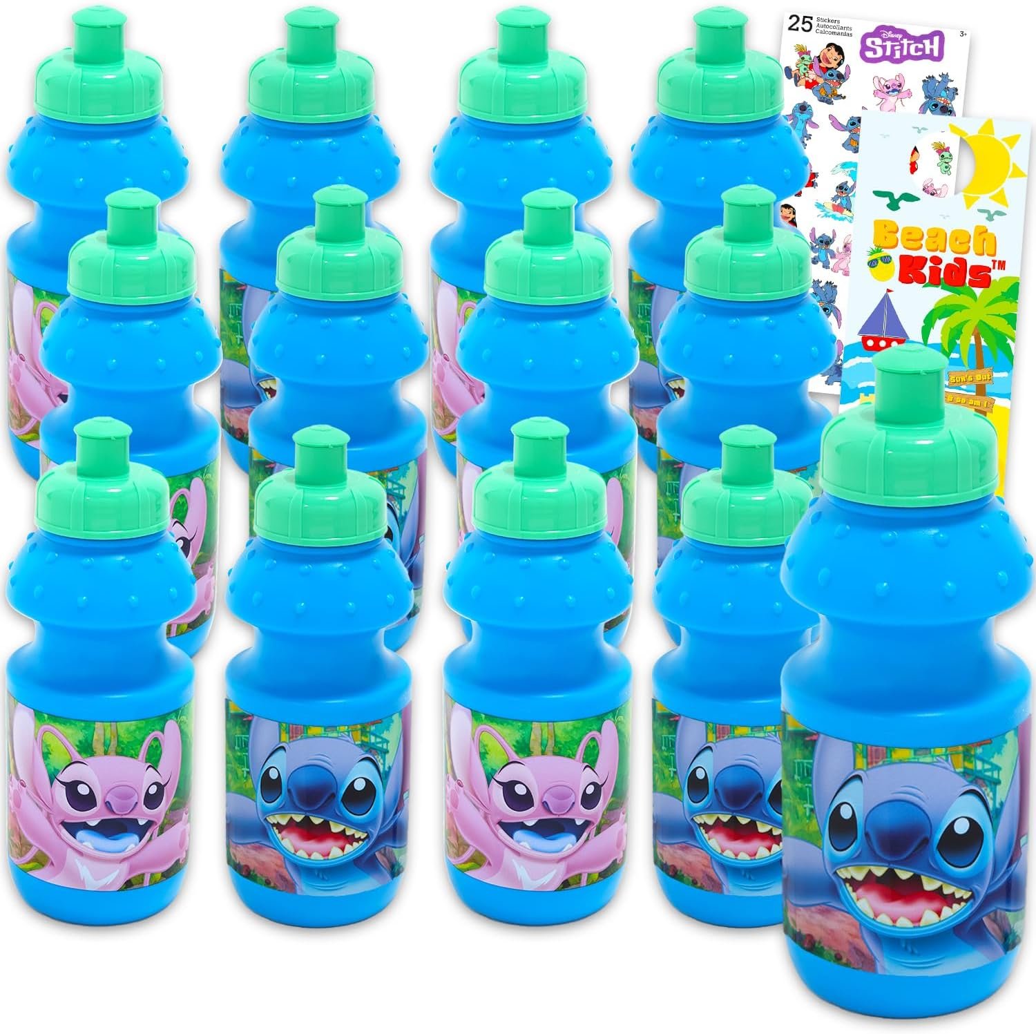 Stitch Kids 11 Oz Reusable Water Bottles – Stitch Party Favor 12 Piece Bundle with 11 Oz Bottle with Pull Top Lid Plus Stickers for Boys, Girls | Bulk Lilo and Stitch Water Bottles. This Stitch party favor bundle comes with 12 reusable Stitch water bottles with pull top lid, each able to hold 11.8 oz of liquid. Sure to be a hit with all Disney fans, these Stitch tumblers are great to use as party favors, party supplies, goodie bag fillers, gift basket fillers, and more! Each durable water bottle depicts colorful artwork of Stitch on a colorful background, perfect to pair with all other Stitch birthday party decorations. Officially licensed Stitch water bottles for kids, boys and girls alike. Set also includes Stitch stickers and a Beach Kids door hanger.