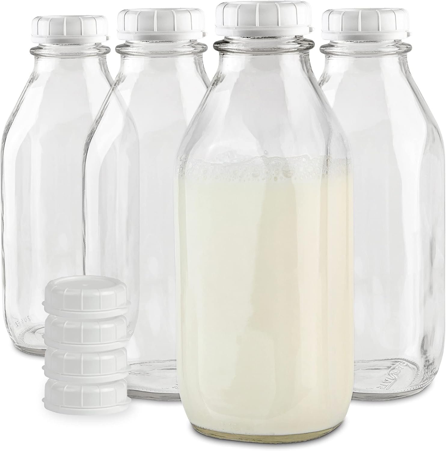 Stock Your Home Liter Glass Milk Bottle with Lid (4 Pack) 32 Oz Jugs and 8 White Caps, Reusable Food Grade Container for Refrigerator, Juice, Oat or Plant Milks, Water, Honey