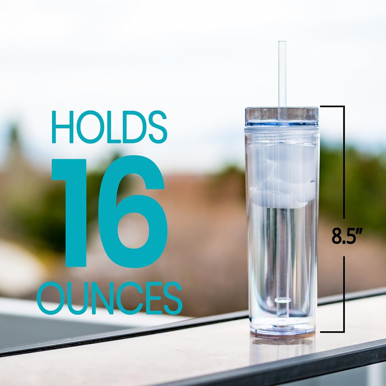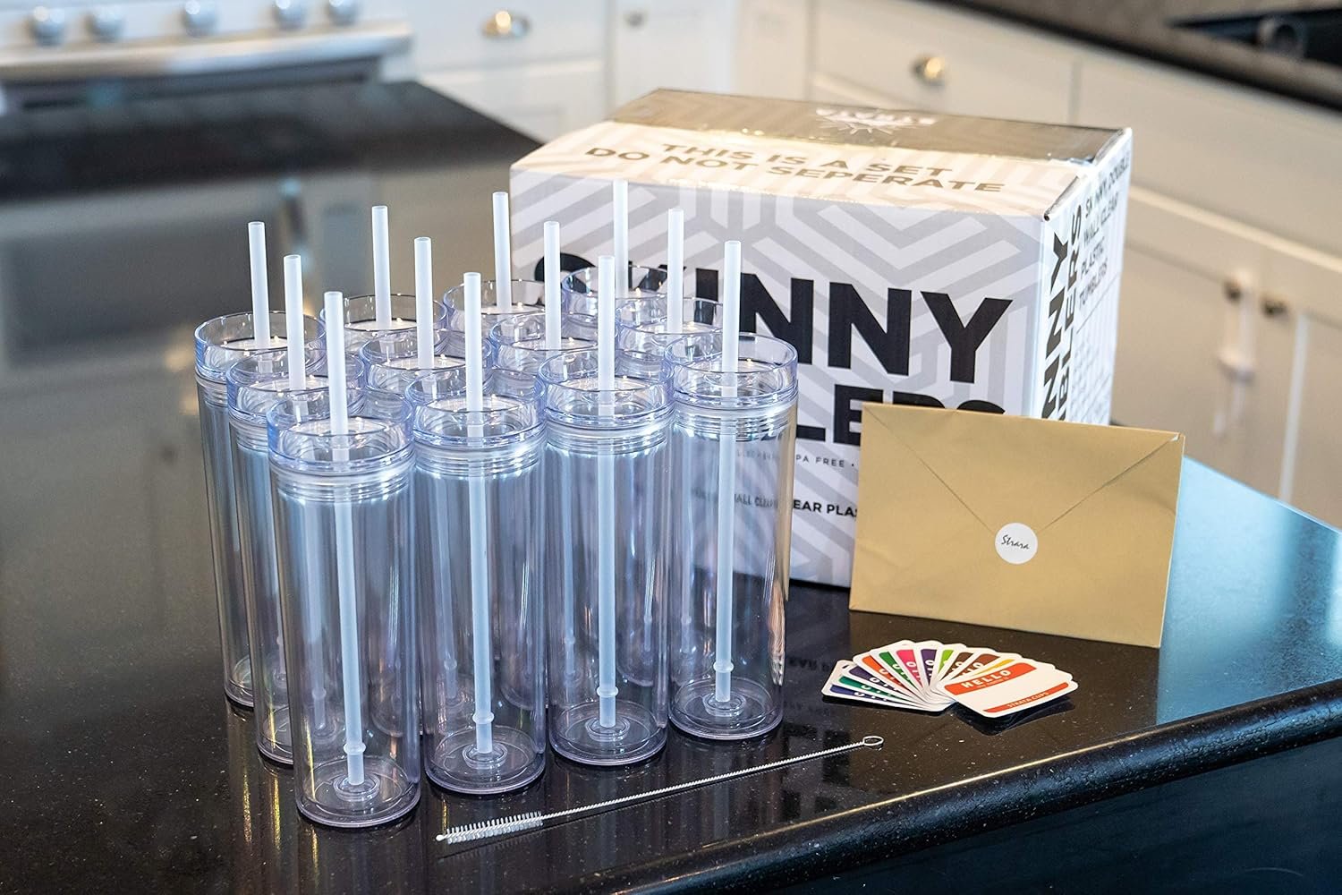 STRATA CUPS 12 Clear Skinny Tumblers with Lids and Straws | 16oz Reusable Cup Double-Wall Clear Tumbler with Lid and Straw, Durable Acrylic Tumblers With FREE Straw Cleaner & Name Tags