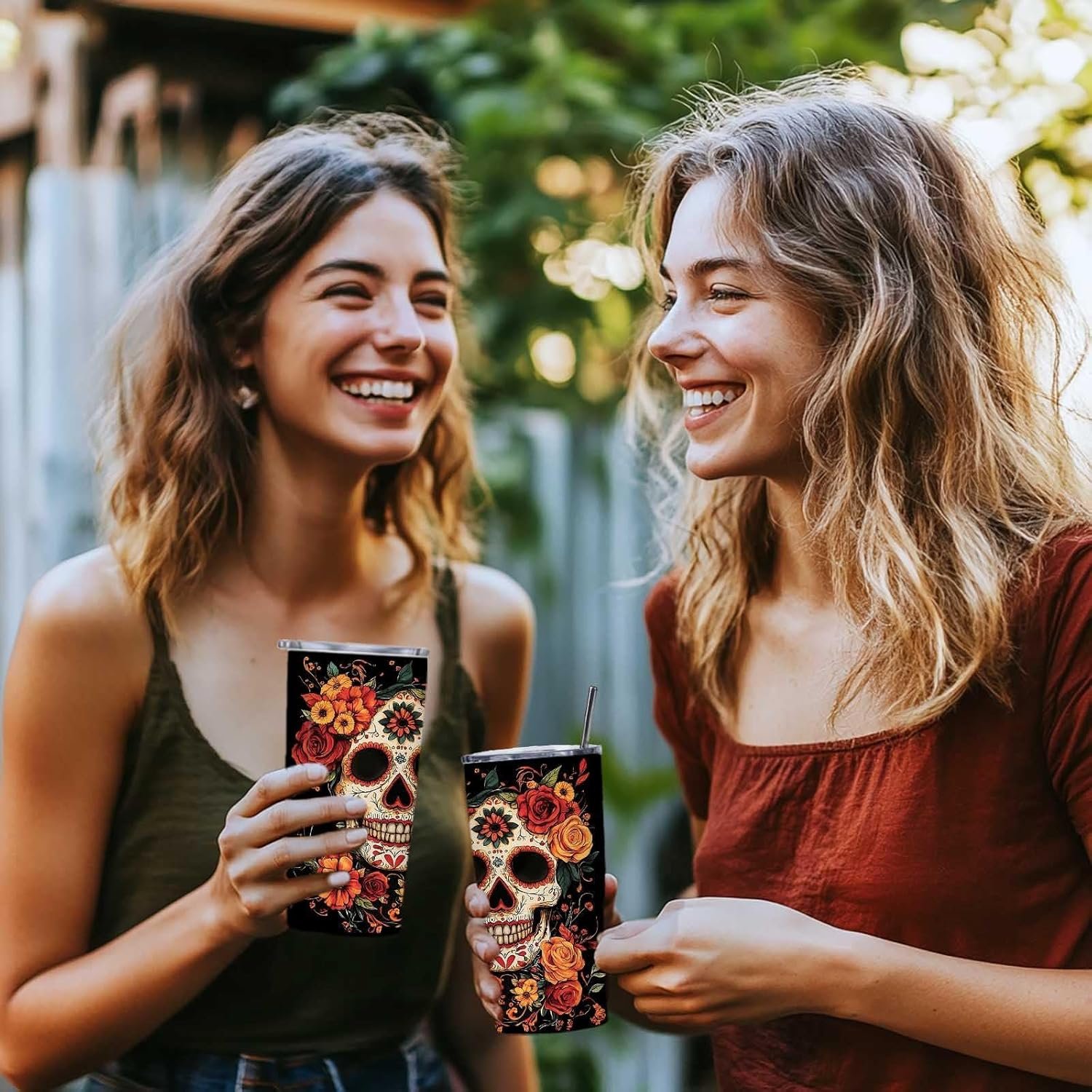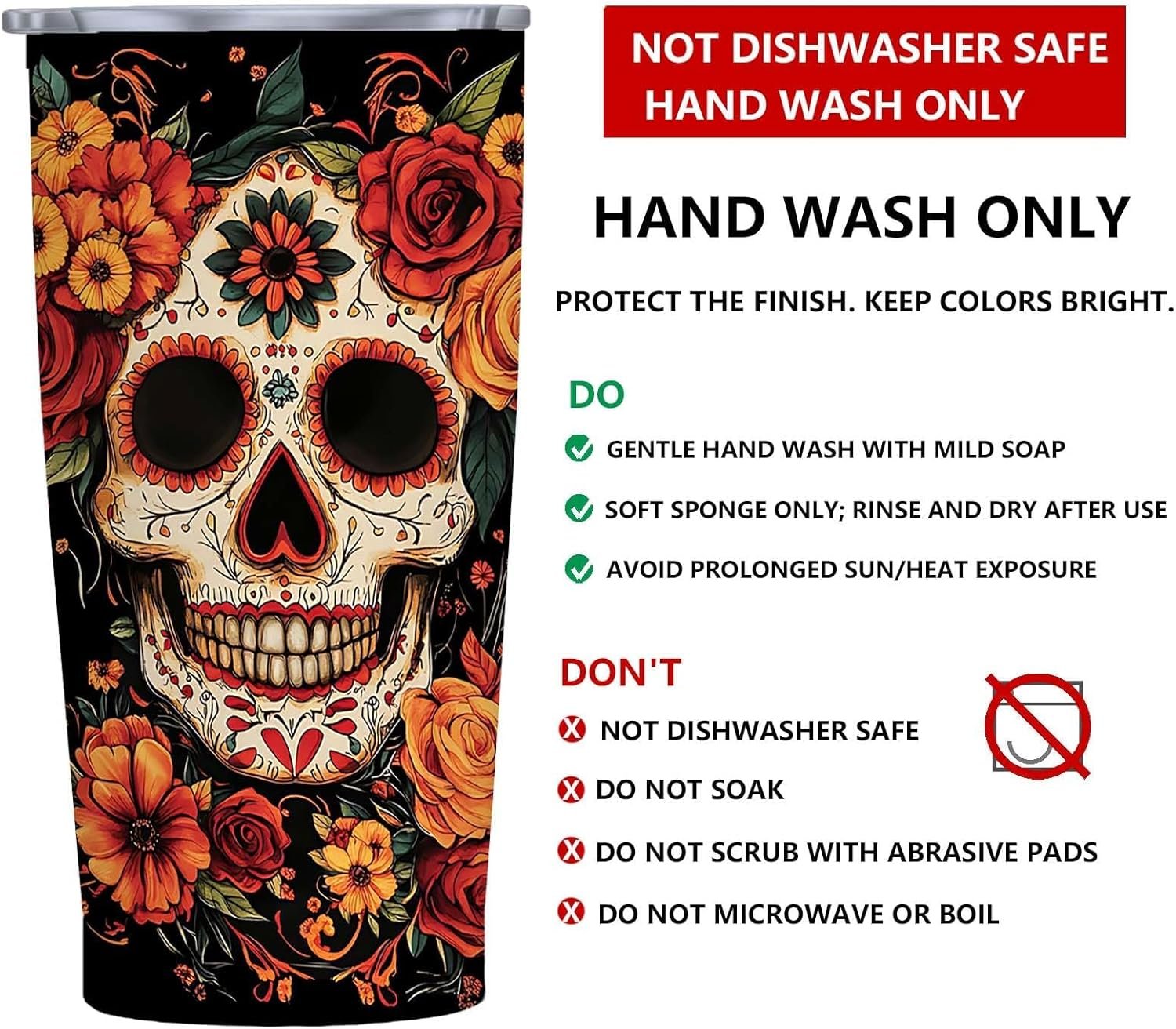 Premium Quality Tumbler for Daily Use: Hand wash only. Not dishwasher safe. This durable 20 oz tumbler, crafted from high-quality stainless steel. Featuring a sleek design, it keeps your drinks cold or hot for hours. Perfect for anyone who loves functional yet fashionable drinkware, it’s great for daily use at home, in the office, or on the go. Whether you’re looking for a unique gift or a personal accessory, this sugar skull tumbler will meet your needs