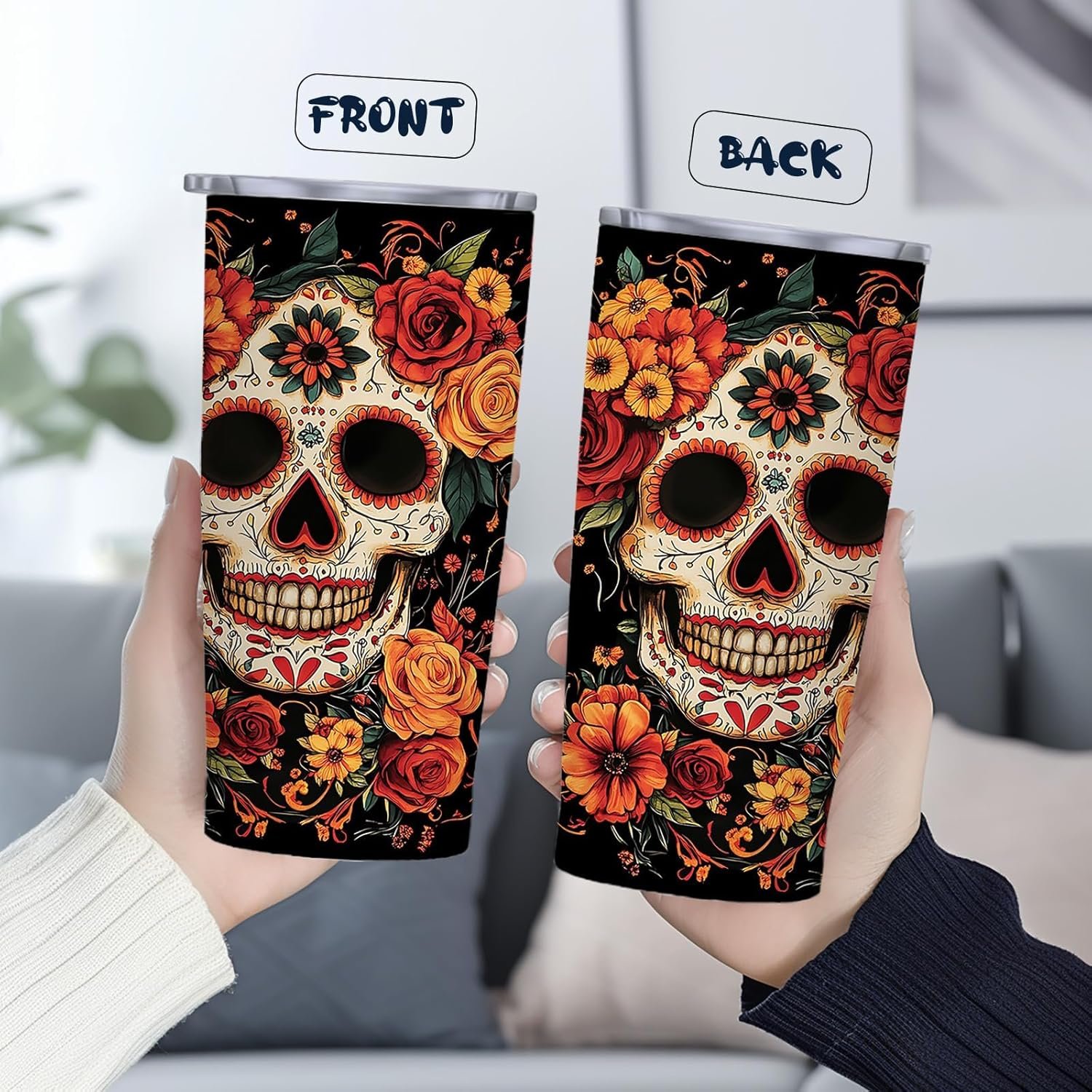 Sugar Skull Rose 20 oz Tumbler, Insulated Stainless Steel, Day of the Dead Halloween Travel Mug, Sugar Skull Gifts for Women & Men, Spooky Witchy Hot & Cold Drink Cup for Christmas & Birthday