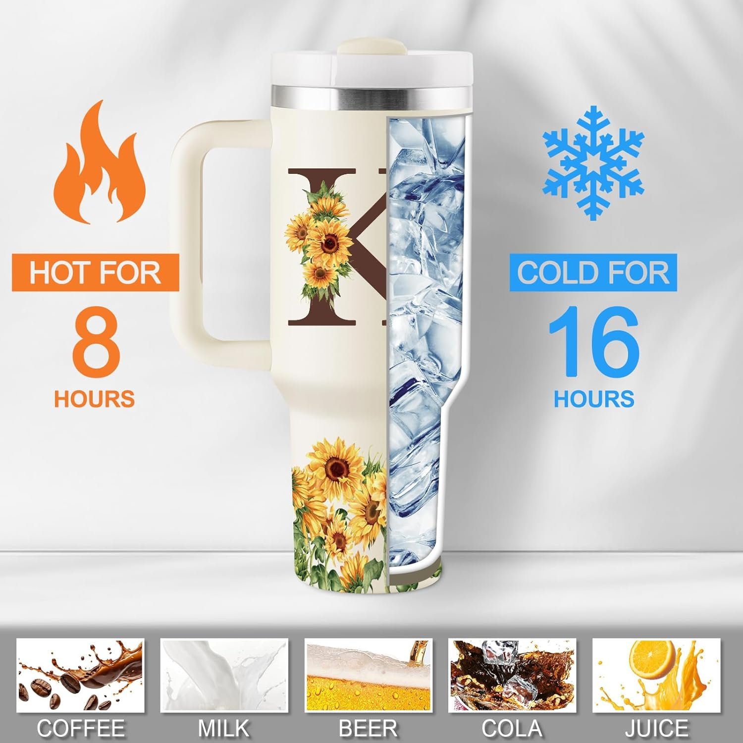 MONOGRAMMED SUNFLOWER GIFTS FOR WOMEN: Featuring vivid patterns, this exquisite 40oz sunflower tumbler makes a meaningful sunflower gifts for women, daughter, mom, wife, girlfriend on birthday, Christmas or any occasion. It is well made with attention to detail, made from premium materials and suitable for a wide range of scenarios, keeps her refreshed with fewer refills.