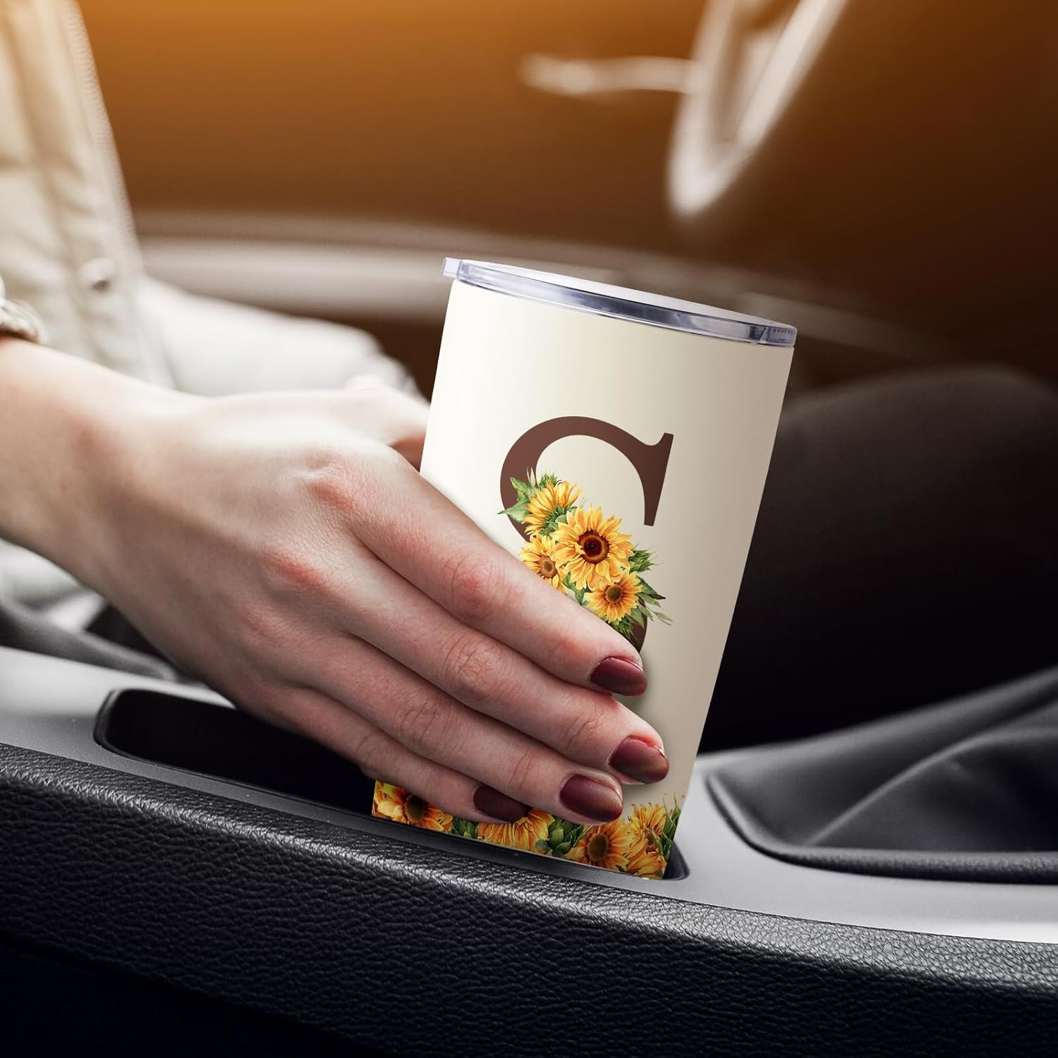 PREMIUM MATERIAL & BPA FREE: The cup body is crafted from 18/8 food-grade stainless steel, ensuring durability, shatter resistance, scratch resistance, and rust prevention. The double-walled vacuum insulation design keeps beverages hot, cold, or warm for hours. Made from recyclable, BPA-free stainless steel, it is environmentally friendly and sustainable. This sunflower cup is suitable for personalized gifts for women, monogrammed gifts for women, initial gifts for women, customized gifts.