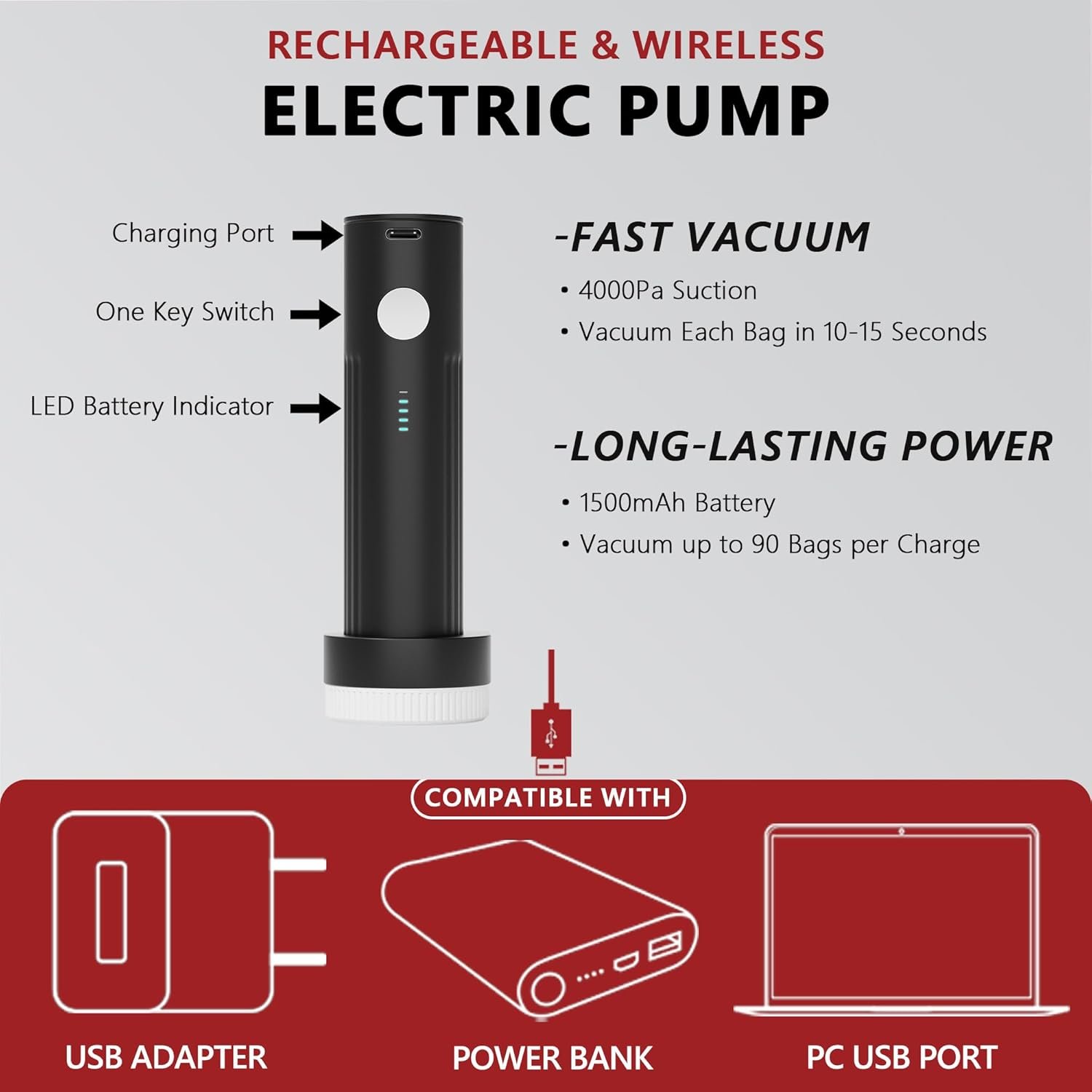 Rechargeable & Wireless Electric Pump: Effortlessly enhance your packing and storage efficiency with our state-of-the-art wireless electric pump. Powered by a 1500mAh battery, it allows up to 90 vacuum sealing per charge. With 4000Pa suction, it can compress a bag in 10-15 seconds.