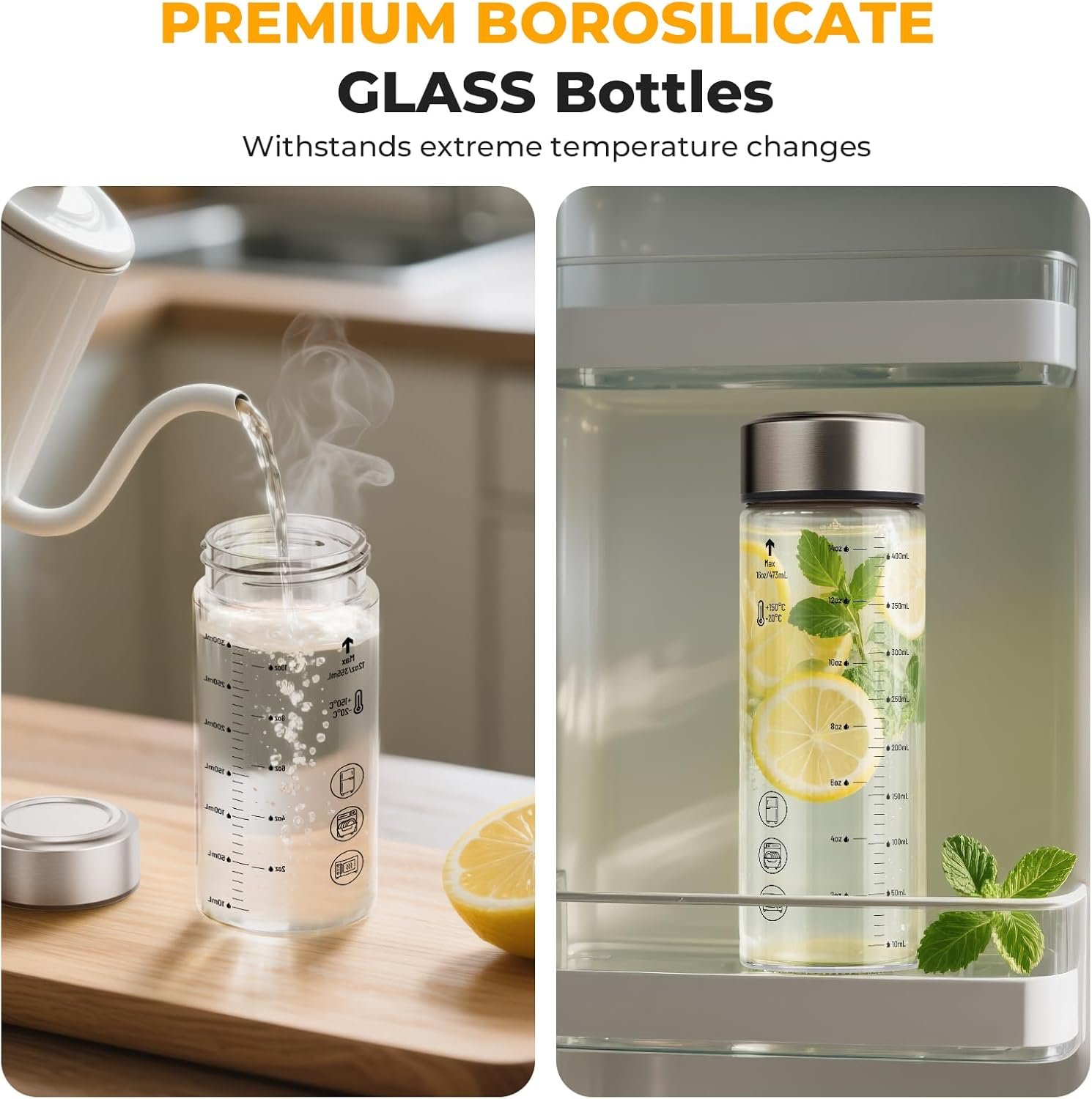 Yes! These bottles are made from thermal shock–resistant borosilicate glass. You can safely pour in hot tea, coffee, or even boiling water without worrying about cracking or breaking.