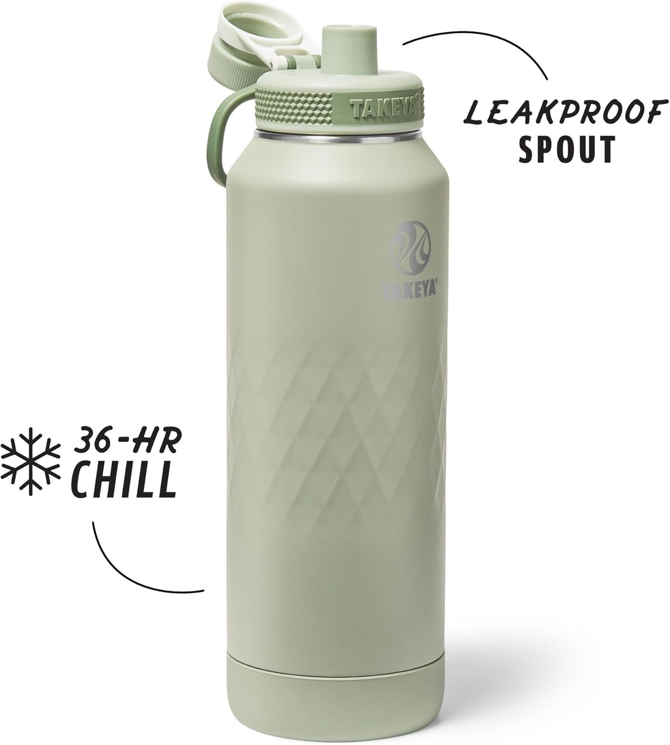 Takeya Sport 40 oz Triple-Insulated Stainless Steel Water Bottle, Spout Lid – Leakproof, Sweatproof, BPA-Free, Keeps Drinks Cold 36 Hrs, Hot 14 Hrs – Eucalyptus
