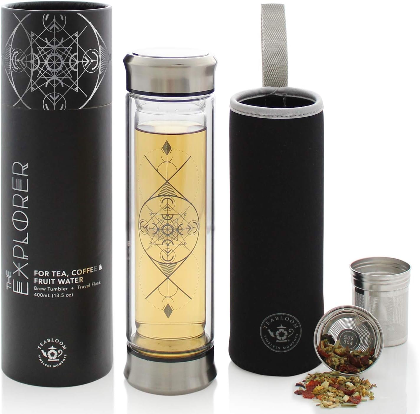 Teabloom All-Beverage Infusion Bottle – 14 oz / 400 ml – Double Wall Insulated Glass Travel Flask – Hot Tea & Cold Brew Coffee Thermos – Removable Sleeve
