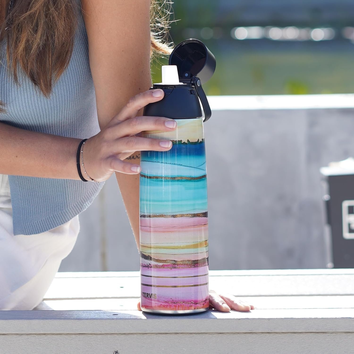 Tervis Venture stainless steel bottle features an easy-to-swap chug spout and straw spout so you can choose how to drink. It also has a push-button opening for one-handed operation, safety lock to prevent spillage, and comfort handle for easy carrying.