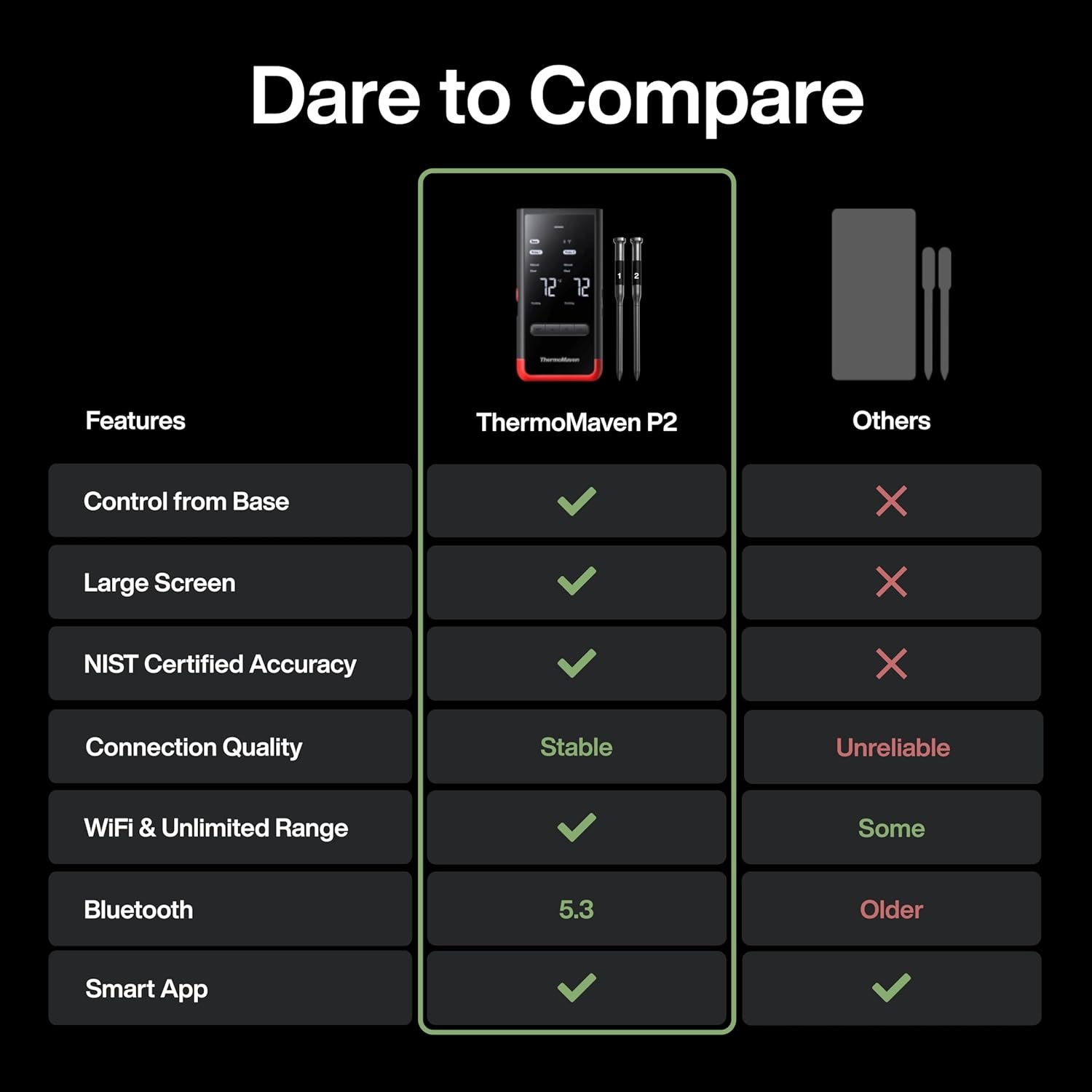 Unlimited Range via Wi-Fi: Many wireless thermometers are restricted to Bluetooth to connect your phone with the base, but the ThermoMaven P2 features advanced 2.4GHz Wi-Fi connectivity. This lets you monitor your culinary creations from anywhere.